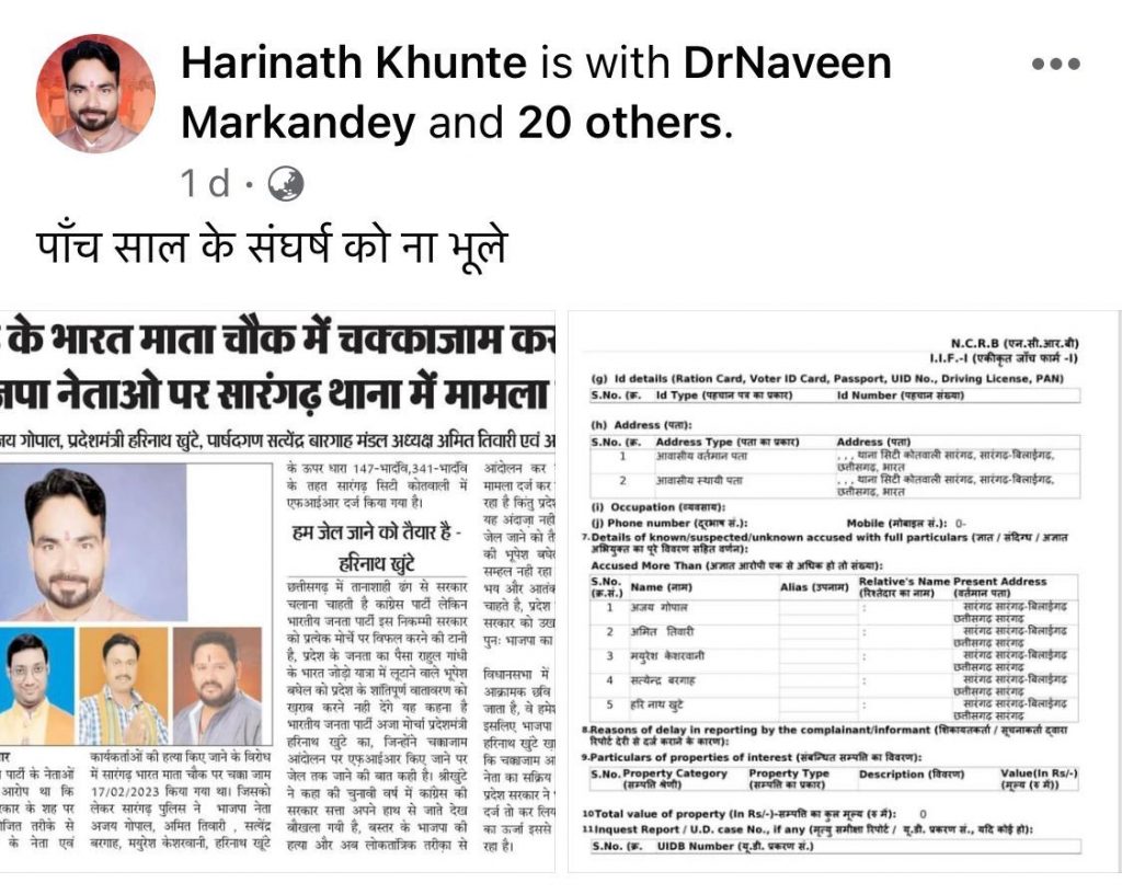 सारंगढ़-बिलाईगढ़। पाँच साल तक भाजपा कार्यकर्ताओं के ऊपर अनैतिक रूप से प्रदेश में बहुत जुल्म हुए है, प्रदेश में हज़ारों कार्यकर्ताओं के एफ़आईआर भी दर्ज हुआ है। सारंगढ़ दे की सारंगढ़ ज़िला में भी ऐसे कई कार्यकर्ताओं के ऊपर पुलिस के द्वारा प्रकरण दर्ज किया गया तथा भाजपा के सक्रिय कार्यकर्ताओं को परेशान किया जा रहा था। विगत दिन भाजपा ज़िला सारंगढ़-बिलाईगढ़ के आक्रामक युवा नेता हरिनाथ खुंटे प्रदेश मंत्री भाजपा अजा मोर्चा ने सोशल मीडिया में एक अख़बार कटिंग पोस्ट करके केप्शन में लिखा है कि “पाँच साल संघर्ष को भुलाया नही जा सकता”, जिसको भाजपा ज़मीनी कार्यकर्ताओं में काफ़ी सकारात्मक चर्चा हो रहा है।