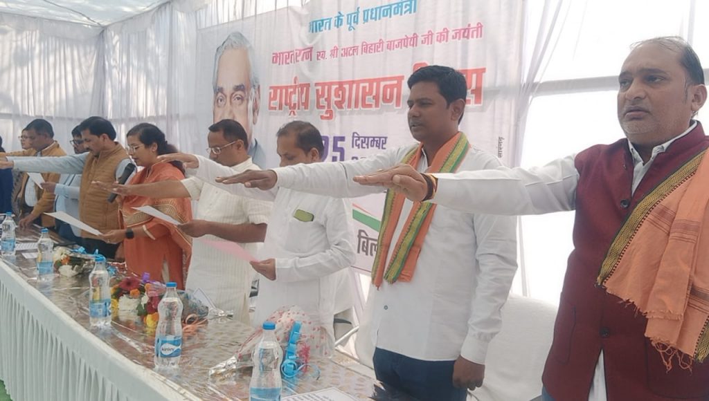 सारंगढ़ बिलाईगढ़ :- 25 दिसंबर 2023/पूर्व प्रधानमंत्री अटल बिहारी वाजपेयी जी के जन्मदिन पर सुशासन दिवस का आयोजन किया गया। सारंगढ़ जनपद पंचायत में कलेक्टर डॉ. फरिहा आलम सिद्दीकी सहित जनप्रतिनिधियों ने वाजपेयी जी की पूजा की। इस अवसर पर कलेक्टर डॉ. सिद्दीकी ने सभी नागरिकों के साथ सुशासन दिवस की शपथ ली। मंच संचालन शिक्षिका प्रियंका गोस्वामी ने की।