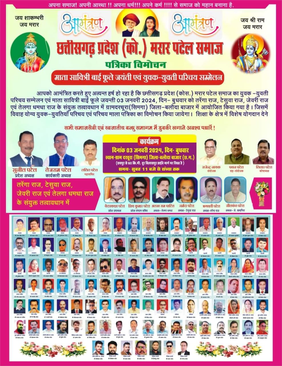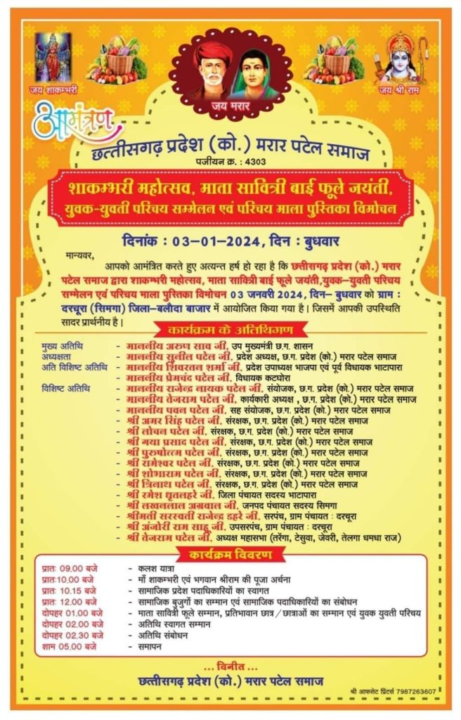 सारंगढ़ :- माता सावित्रीबाई फुले की जयंती के अवसर पर मरार पटेल समाज का युवक-युवती परिचय सम्मेलन सिमगा के दरचुरा में आयोजित किया गया है, जिसमें प्रदेश भर से मरार समाज के लोग शामिल होंगे व विवाह योग्य युवक-युवतियां अपना परिचय देंगे। बता दें कि हर वर्ष मरार पटेल समाज की ओर से 3 जनवरी माता सावित्री बाई फुले की जयंती अवसर पर यह भव्य कार्यक्रम आयोजित किया जाता रहा है। इस वर्ष कार्यक्रम में बतौर मुख्य अतिथी नवनियुक्त उपमुख्यमंत्री अरूण साव शामिल होंगे