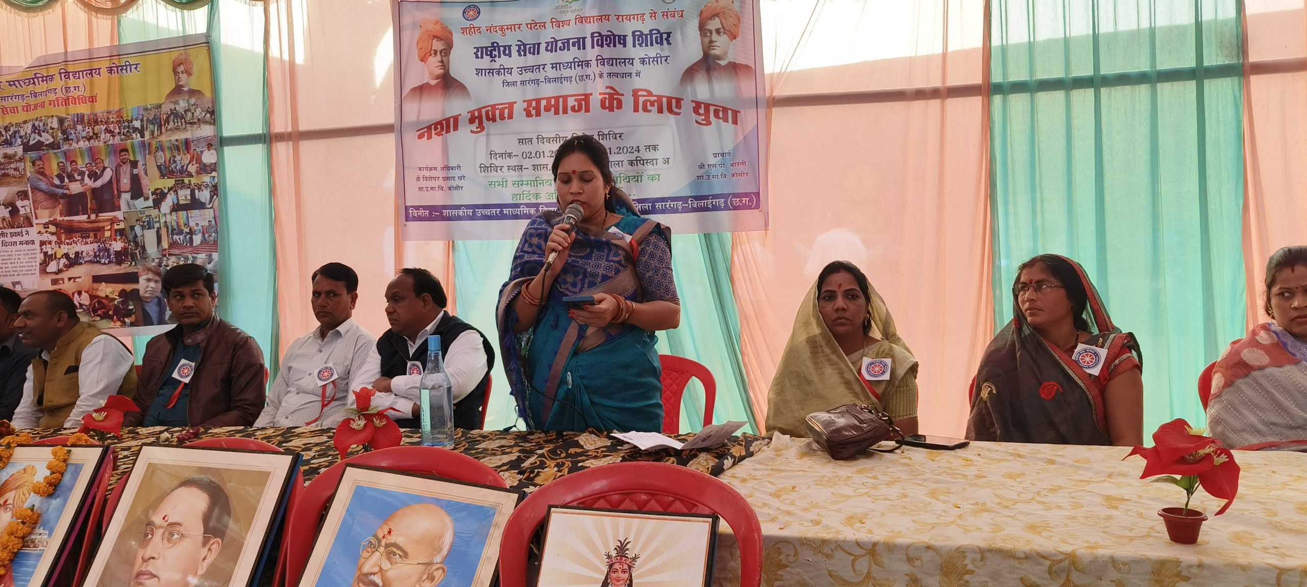 सारंगढ़ विधायक श्रीमती उत्तरी गनपत जांगड़े ने शिविर को संबोधित करते हुए बधाई दी और बोले “पढ़ाई- लिखाई के साथ-साथ जीवन में बहुत कुछ सीखना पड़ता है आज आप लोग घर से दूर हैं । 7 दिन तक यहां बहुत कुछ सीखेंगे और ग्रामीणों को भीआप लोगों से सीखने को मिलेगा वहीं उन्होंने कहा गुरु है तो हम हैं गुरु ही हमें इस योग्य बनाते हैं और हमें मंजिल पहुंचते हैं ”