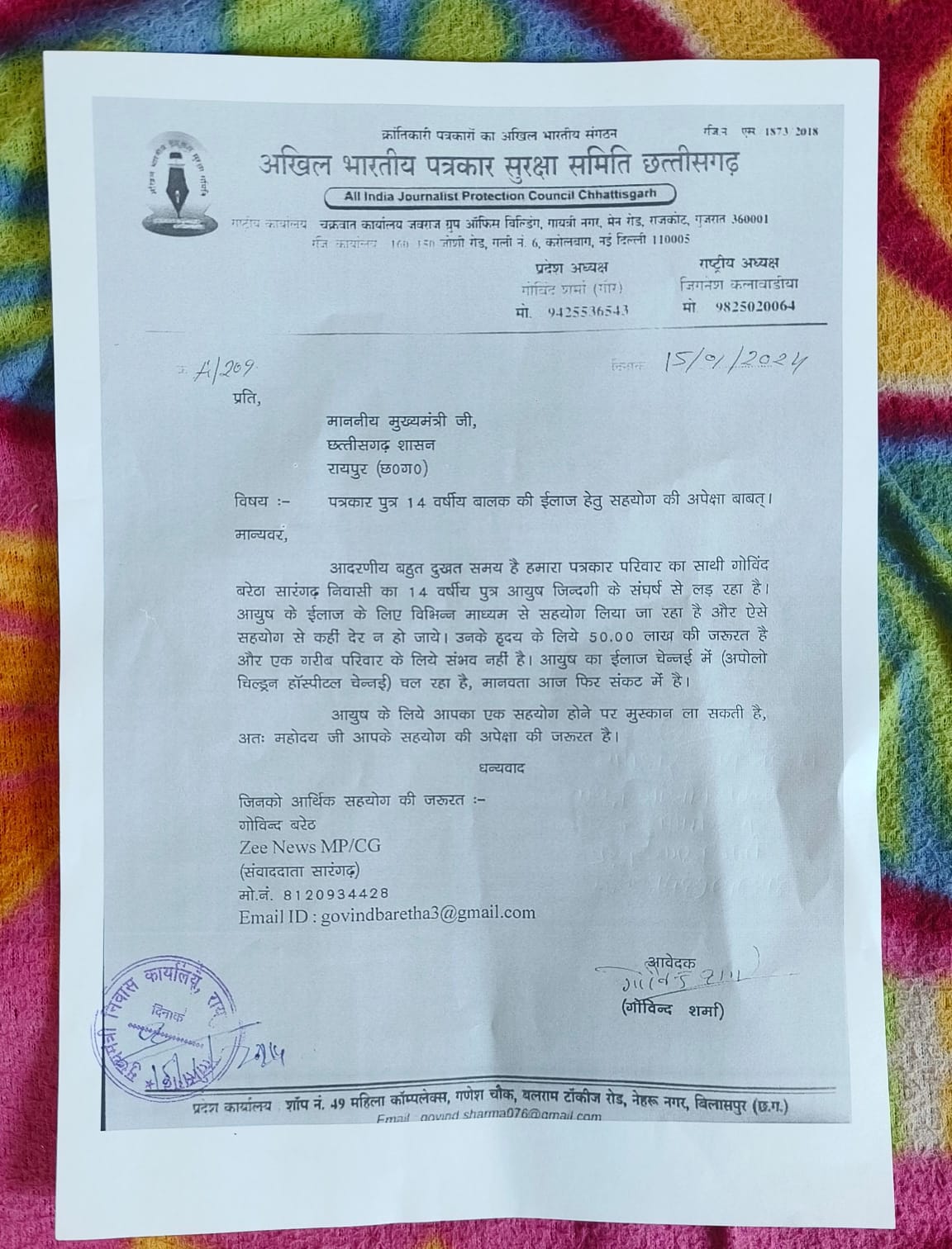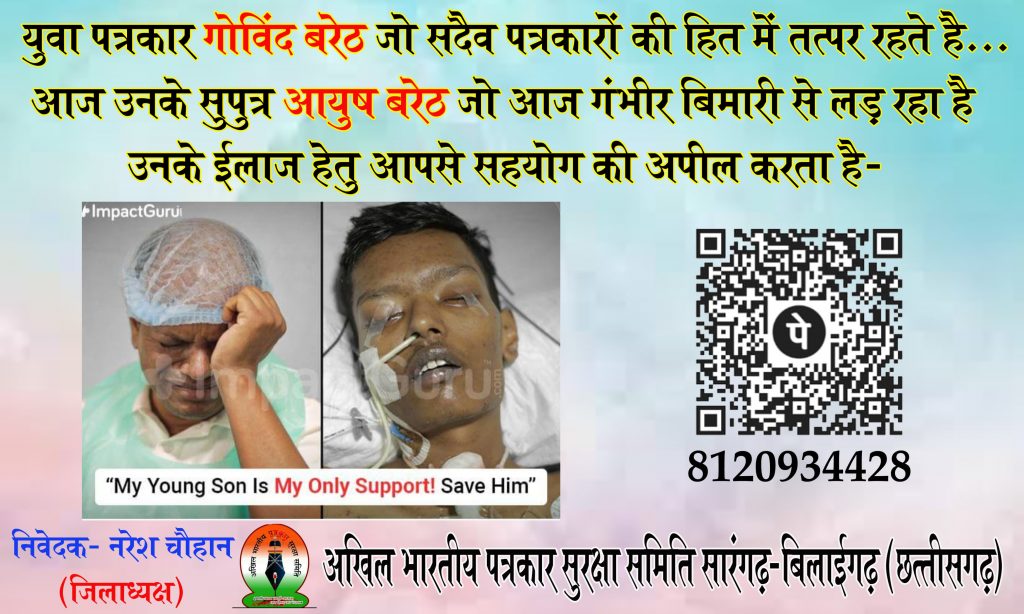 जिसमें पीड़ित पत्रकार गोविंद इ के युवा पुत्र आयुष बरेठा के इलाज के लिए पचास लाख रुपए की आर्थिक सहायता की मांग करते हुए आयुष बरेठा के लिए आपका एक सहयोग नयी जिंदगी व एक मुस्कान लाने की उम्मीद आप पर टिकी हुई है माननीय मुख्यमंत्री सहयोग करें जिसके लिए अखिल भारतीय पत्रकार सुरक्षा समिति छत्तीसगढ़ प्रदेश के साथ ही पूरे भारत में जुड़े अखिल भारतीय पत्रकार सुरक्षा समिति का हर सदस्य आपका आभारी रहेगा।
