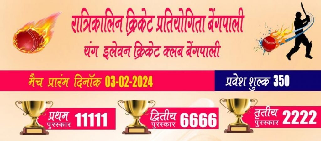 (बेंगपाली)। गांव में शनिवार को रात्रिकालीन क्रिकेट प्रतियोगिता का फाइनल मुकाबला बेंगपाली व दुरुग की टीम के बीच खेला गया। फाइनल मुकाबले में बेंगपाली की टीम ने दुरूग की टीम को 17रनो से हराकर प्रतियोगिता अपने नाम की।रात्रि कालीन टेनिस बॉल क्रिकेट प्रतियोगिता बेगपाली में प्रारंभ हुआ दिनांक/ 03/02/ 2024 को शुभारंभ हुआ वहीं अंतिम तिथि 10/02 /2024 को अंतिम तिथि क्रिकेट का समापन हुआ मुख्य अतिथि श्रीमती शीतल देवी रमेश चौहान फाइनल मैच यंग मैच 11 बेगपाली गेम चेंजर द्वारा टास्क विनिंग करते हुए डिसीजन लिया गया फील्डिंग का ऑप्शन चुना गया पहले बैटिंग यंग 11 बेगपाली का स्कोर रहा 118 रन दूसरा बैटिंग गेम चेंजर स्कोर रहा 101 रन यंग 11 बेगपाली भारी मतों से 17 रन पर जीत हासिल किए हैं