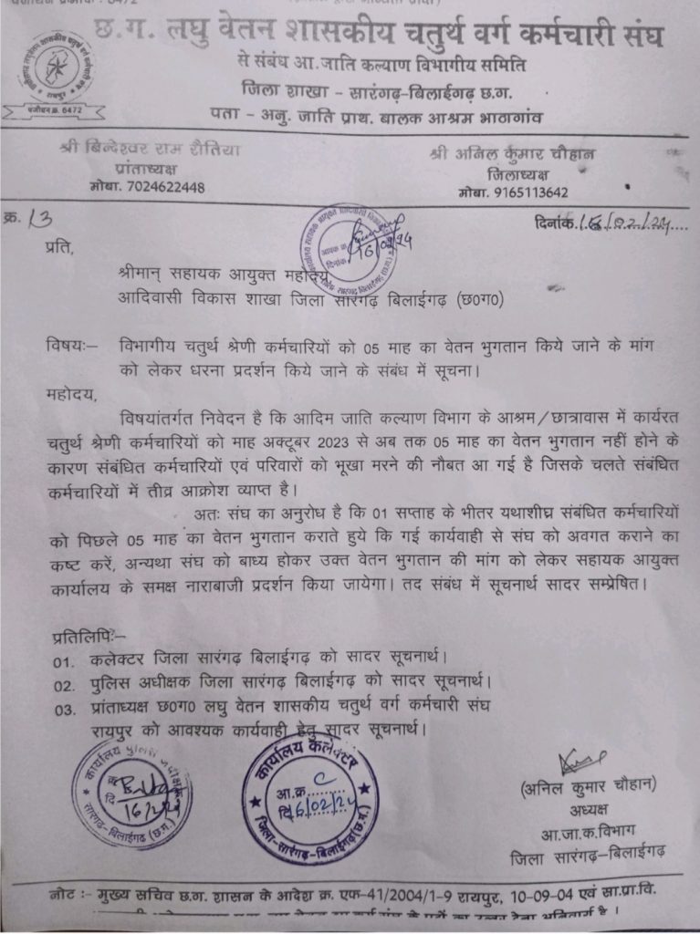 सारंगढ़ बिलाईगढ़ :- छत्तीसगढ़ आदिम जाति कल्याण विभाग में कार्यरत छ.ग. लघु वेतन शासकीय चतुर्थ श्रेणी के कर्मचारियों को अक्टूबर से लेकर अब तक 5 महीने की वेतन भुगतान नहीं किए जाने पर कर्मचारियों के परिवार की आर्थिक स्थिति कमजोर हो गई है जिसका असर सीधे बच्चों समेत परिवारजनों को भूखा मरने की हो गई जिससे कर्मचारियों में सरकार के प्रति भारी आक्रोश व्याप्त हो रही है