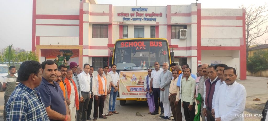 सारंगढ़-बिलाईगढ़ :- जिले के कलेक्टर श्री धर्मेश कुमार साहू ने श्रीरामलला दर्शन योजना के लिए छत्तीसगढ़ से अयोध्या तक चलाई जा रही विशेष ट्रेन हेतु चलाई जा रही बस को 11 मार्च को हरी झंडी दिखाकर रवाना किया। इस मौके पर अरविन्द हरिप्रिया, अजय गोपाल, अमित अग्रवाल, स्थानीय जनप्रतिनिधिगण एवं परियोजना अधिकारी श्री हरिशंकर चौहान एवं उप संचालक समाज कल्याण विभाग श्री विनय तिवारी उपस्थित थे। कलेक्टर श्री साहू ने रामलला दर्शन के लिए जाने वाली बस को सोमवार सुबह 7 बजे कलेक्ट्रेट परिसर से हरी झंडी दिखाकर रवाना किया। इस बीच अयोध्या जाने वाले श्रद्धालुओं में खुशी एवं उत्साह का माहौल था।