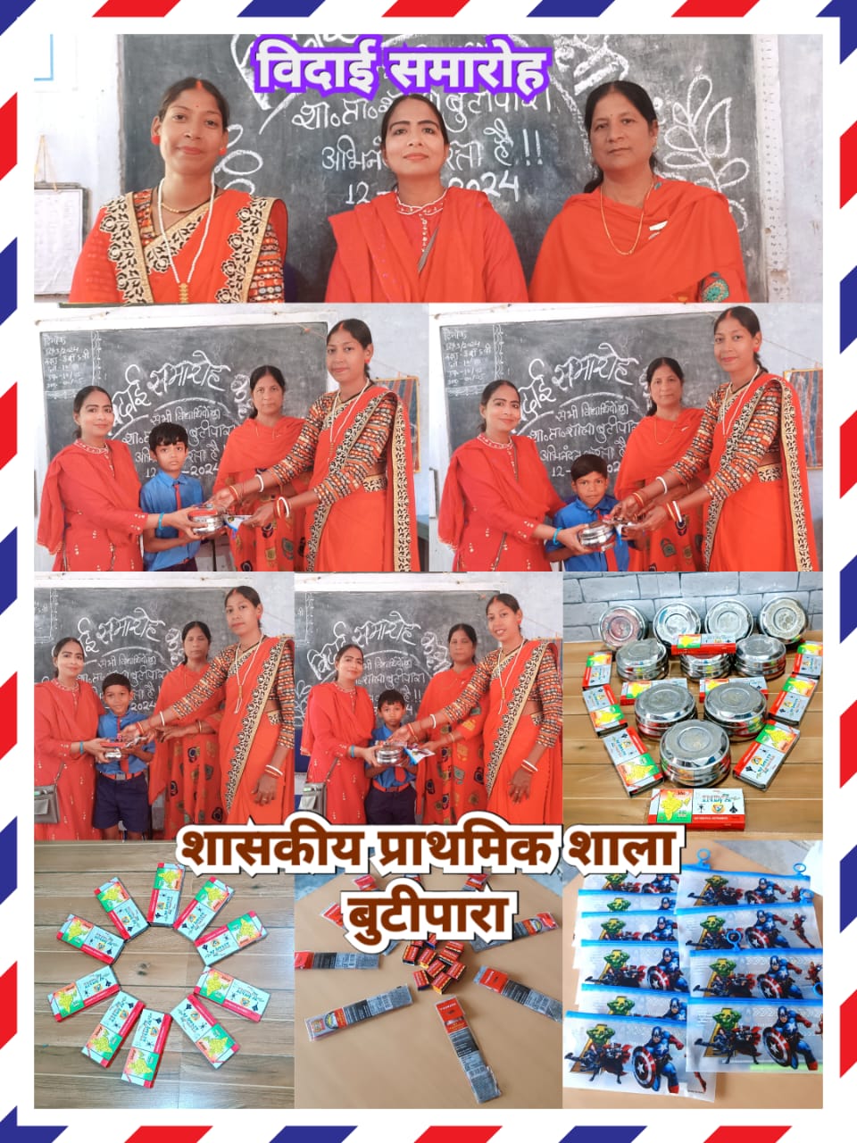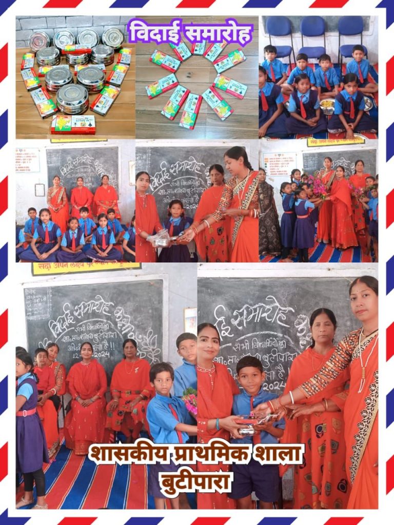स्कूल शिक्षा विभाग छत्तीसगढ़ शासन की नित नूतन शैक्षणिक योजनाओं का अपने विद्यालय में पूरी निष्ठा से सतत आयोजन एवम क्रियान्वयन क़रतीं रहतीं हैं ,इसी कड़ी में चन्द्रकांति स्वर्णकार द्वारा पॉलीथिन कंपास एवम रेखा यादव द्वारा स्केल , कटर भेंट किया गया । विद्यार्थियों को मोटिवेशनल ग्रीटिंग्स कार्ड दिया गया,इस अवसर पर शाला प्रबंध समिति के अध्यक्ष भगतराम माली उपस्थित रहे, कक्षा पाँचवीं से मुस्कान सिदार,टिकेश्वरी संवरा,सिद्धि यादव,नन्दनी बरेठ,मानवी देवांगन, धारा सिदार, समीर बसोड़ ,रिषभ माली,उदय मालाकार,हिमेश निषाद को कक्षा चौथी के विद्यार्थियों द्वारा विदाई दी गई , स्वल्पाहार में बच्चों का मुँह मीठा कराया गया एवम भावी जीवन की शुभकामनाएं दी गईं ।