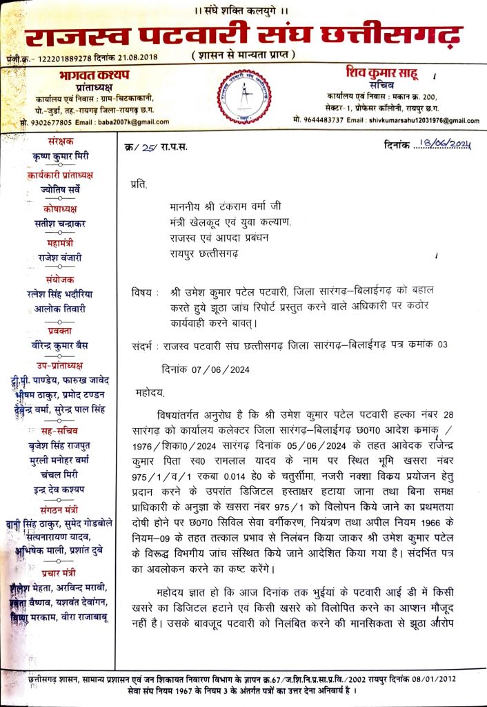 संदर्भित पत्र का अवलोकन करने का कष्ट करेंगे।ज्ञात हो कि आज दिनांक तक भुईयां के पटवारी आई डी में किसी खसरे का डिजिटल हटाने एवं किसी खसरे को विलोपित करने का आप्शन मौजूद नहीं है। उसके बावजूद पटवारी को निलंबित करने की मानसिकता से झूठा आरोपलगाकर कार्यवाही की गई है जो कि अत्यंत ही निंदनीय है। इस आदेश को देखकर राजस्व पटवारी संघ के सभी सदस्य भयभीत हैं इस तरह के आदेश से स्पष्ट है कि पटवारियों पर कार्यवाही करने की मानसिकता वाले अधिकारी अपने पद का दुरूपयोग करते हुये कभी भी किसी पटवारी पर कार्यवाही कर सकते हैं।उपरोक्त आदेश को संज्ञान में लेते हुये निष्पक्ष जांच कराने का कष्ट करें तथा पटवारी को निलंबन से बहाल करते हुये झूठा आरोप लगाते हुये जांच रिपोर्ट प्रस्तुत करने वाले अधिकारी के विरूद्ध कार्यवाही करने के लिये ज्ञापन सौपा है।