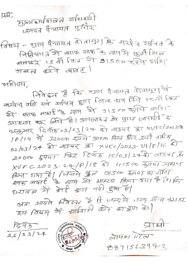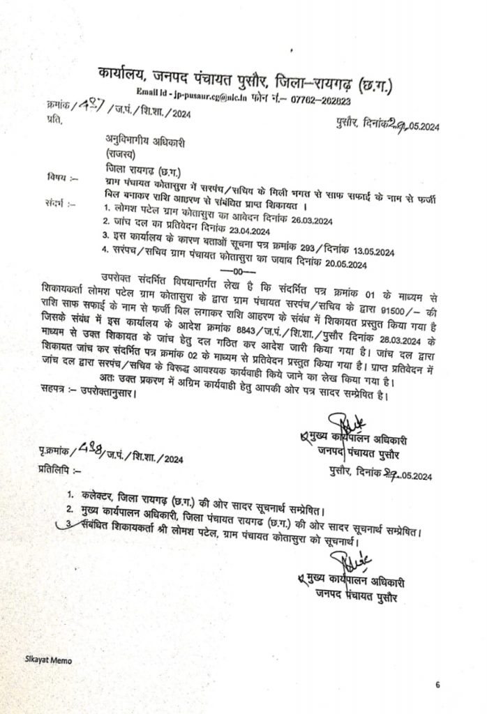 रायगढ़ जिले के पुसौर जनपद पंचायत अंतर्गत ग्राम पंचायत कोतासुरा मे सरपंच सचिव के खिलाफ फर्जी बिल के माध्यम से आहारण करने की शिकायत दिनांक 26/03/24 को जनपद पंचायत सीईओ से की गई थी जिस पर जनपद सीईओ के बनाये कमेटी ने शिकायत जांच प्रतिवेदन की अवलोकन में पंचायत में हुए भ्रष्टाचार की शिकायत को सही पाया है।