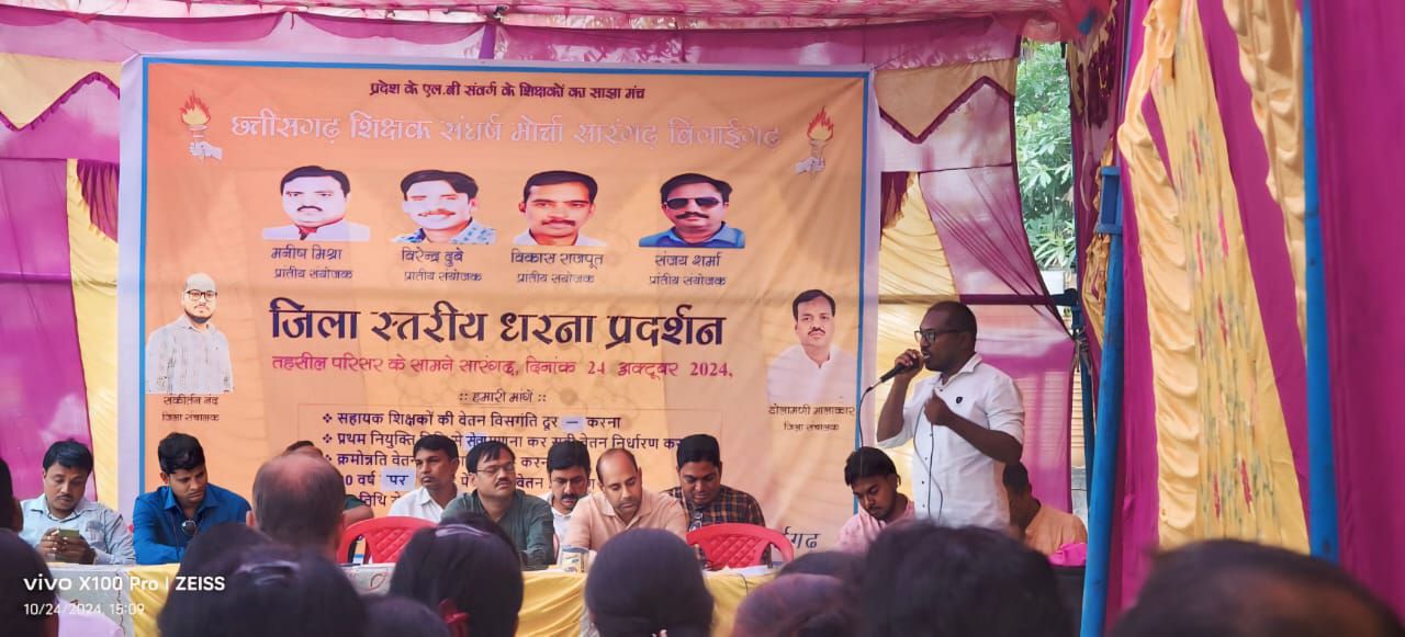 सारंगढ़ :- छत्तीसगढ़ शिक्षक संघर्ष मोर्चा के प्रांतीय आहवान पर सारंगढ़ बिलाईगढ़ जिले के हजारों शिक्षकों ने गुरुवार को जिला संचालक संकीर्तन नंद, डोलामणी मालाकार कि अगुवाई मे सामूहिक अवकाश पर रहकर तहसील आफिस के बगल सारंगढ़ में धरना प्रदर्शन में बैठे। जिसका व्यापक असर जिले के स्कूलों में देखने को मिला, स्कूलों में शिक्षक की अनुपस्थिति मे लगभग स्कूल बंद दिखे।