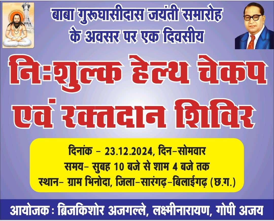 सारंगढ़-बिलाईगढ़ (छत्तीसगढ़): – गुरु घासीदास बाबा की जयंती के शुभ अवसर पर ग्राम भिनौदा में नि:शुल्क स्वास्थ्य जांच एवं रक्तदान शिविर का आयोजन किया जा रहा है। यह एक दिवसीय शिविर 23 दिसंबर 2024, सोमवार को सुबह 10 बजे से शाम 4 बजे तक आयोजित होगा।