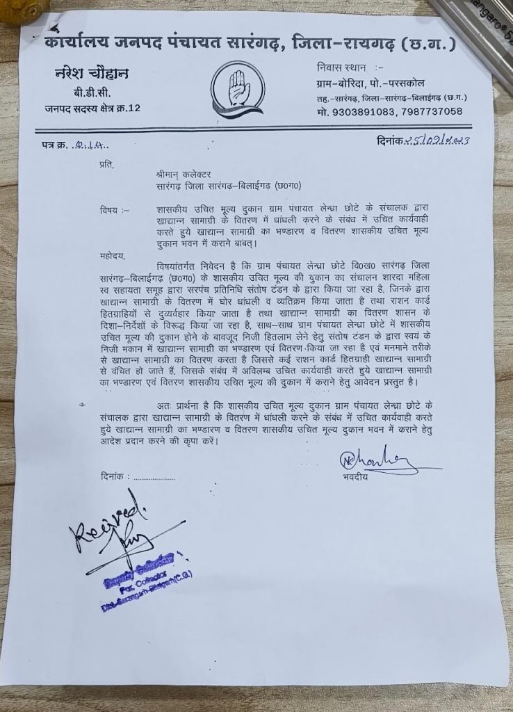 सारंगढ़ बिलाईगढ़ जिले में कलेक्टर जनदर्शन में आज प्रशासनिक अधिकारियों को अवगत कराया और तत्कालीन जांच करने की अपील की है। तथा वहीं राशन सामग्री में भ्रष्टाचारी कर गबन किया गया है। जिसको तत्काल संज्ञान में लेते हुए ड्यूटी कलेक्टर महेश्वरी जी से जनदर्शन में शिकायत दर्ज कराई और ग्रामीणों को इंसाफ दिलाने के लिए प्रशासनिक अधिकारियों से अपील की है।राशन वितरण में धांधली का आरोप लगा रहे लोगों का कहना था कि राशन डीलर द्वारा पिछले एक महीने से ग्रामीणों को राशन नहीं दिया जा रहा है।