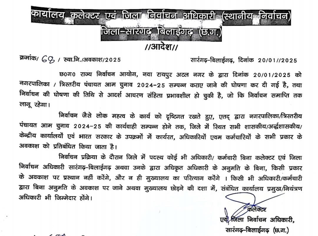 सारंगढ़ बिलाईगढ़ :- निर्वाचन आचार संहिता लागू होने पर छत्तीसगढ़ राज्य निर्वाचन आयोग के निर्देशानुसार कलेक्टर व जिला निर्वाचन अधिकारी धर्मेश कुमार साहू ने निर्वाचन जैसे लोक महत्व के कार्य को दृष्टिगत रखते हुए नगरीय निकाय और पंचायत आम चुनाव 2025 की कार्यवाही संपन्न होने तक जिले में स्थित सभी शासकीय, अर्द्धशासकीय, केन्द्रीय कार्यालयों एवं भारत सरकार के उपक्रमों में कार्यरत अधिकारियों, कर्मचारियों के सभी प्रकार के अवकाश को प्रतिबंधित किया जाता है।