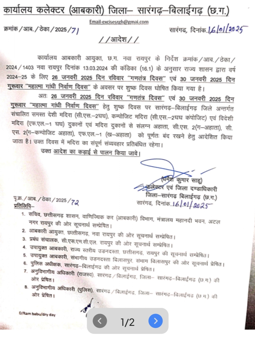 सारंगढ़ बिलाईगढ़ :- कलेक्टर एवं जिला दण्डाधिकारी धर्मेश कुमार साहू ने राष्ट्रीय पर्व गणतंत्र दिवस 26 जनवरी रविवार और 30 जनवरी गुरुवार को महात्मा गांधी निर्माण दिवस के अवसर पर जिले को को शुष्क दिवस घोषित का आदेश जारी किया है। इस आदेश के पालन में सारंगढ़ बिलाईगढ़ जिले की सीमा में संचालित समस्त देशी मदिरा दुकान (सीएस-2 घघ), कंपोजिट मदिरा (सीएस-2 घघ कंपोजिट), विदेशी मदिरा दुकान (एफ.एल-1 घघ) दुकानों एवम मदिरा दुकानों से संलग्न अहाता, सीएस 2 (ग- अहाता), सीएस 2 (ग- कंपोजिट अहाता), एफ एल 1 (ख- अहाता) को पूर्णतः बंद रहेगा। इस दौरान मदिरा का संपूर्ण संव्यवहार प्रतिबंधित रहेगा।