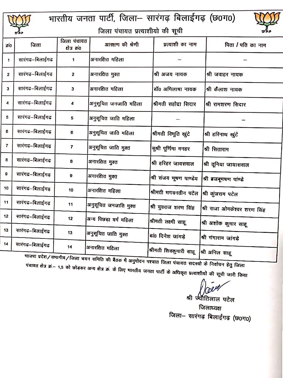 सारंगढ़ बिलाईगढ – सारंगढ़ बिलाईगढ़ जिले के 14 मे 2 सीट खाली छोड़ा गया है भारतीय जनता पार्टी ने अपने अधिकृत उम्मीदवारों की घोषणा कर दी है