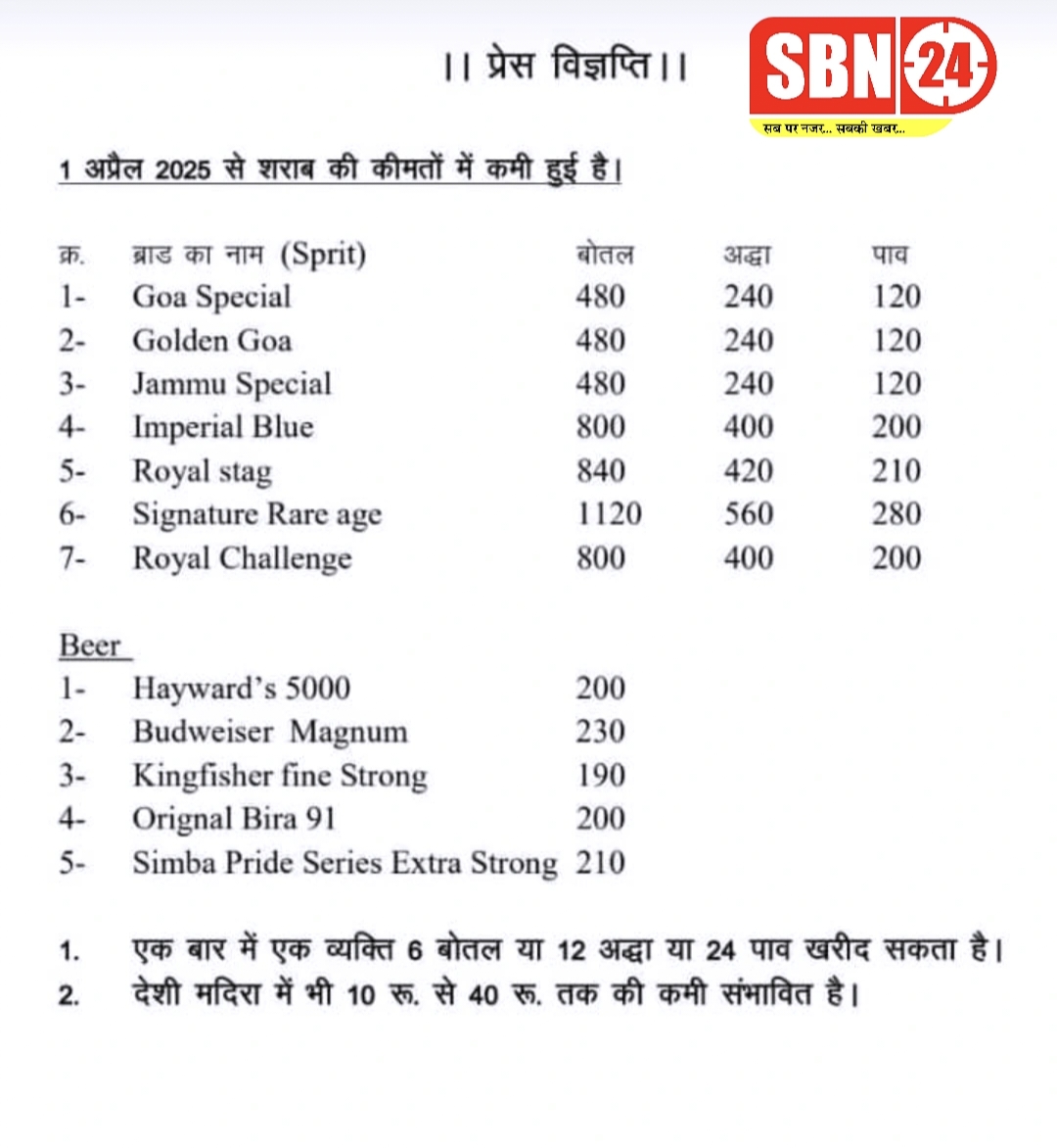 सारंगढ़ बिलाईगढ़ :- राज्य शासन ने मदिरा के बिक्री में कीमत को कम किया है। एक बार में एक व्यक्ति छह बोतल या 12 अद्घा या 24 पाव खरीद सकता है। देशी मदिरा में भी ₹10 से ₹40 तक की कमी संभावित है। यह दर 1 अप्रैल 2025 से लागू होगा, जिसमें गोवा स्पेशल, गोल्डन गोवा जम्मू स्पेशल की बोतल को ₹480 में खरीदी होगी। इसी प्रकार इनका आधा 240 रुपए में और ₹120 में पाव बिक्री की जाएगी। रॉयल स्टैग का बोतल 840 रुपए,आधा 420 रुपए में और ₹ 210 में पाव की बिक्री की जाएगी। इंपीरियल ब्लू और रॉयल चैलेंज की बोतल ₹800 में बिक्री की जाएगी। इनका आधा 400 रुपए में और ₹200 में पाव की बिक्री की जाएगी। सिग्नेचर रेयर एज की बोतल 1120 रुपए में, इनका आधा 560 रुपए में और ₹280 में पाव की बिक्री की जाएगी।