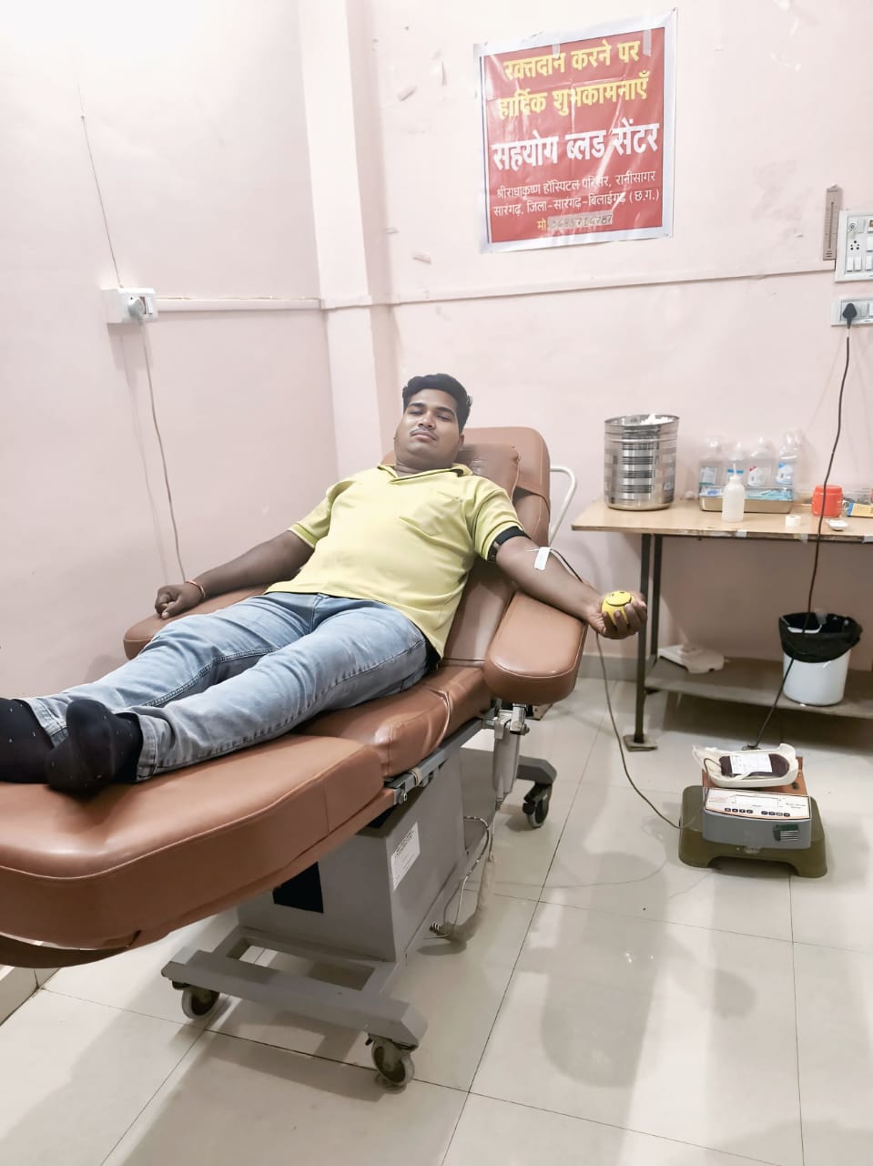 सारंगढ़ बिलाईगढ़ :- सारंगढ़-बिलाईगढ़ सर्व समाज युवा महासंघ जिलाध्यक्ष टुकेश्वर मानिकपुरी ने की जरूरतमंद मरीज को रक्तदान कर मानवता का दिया परिचय