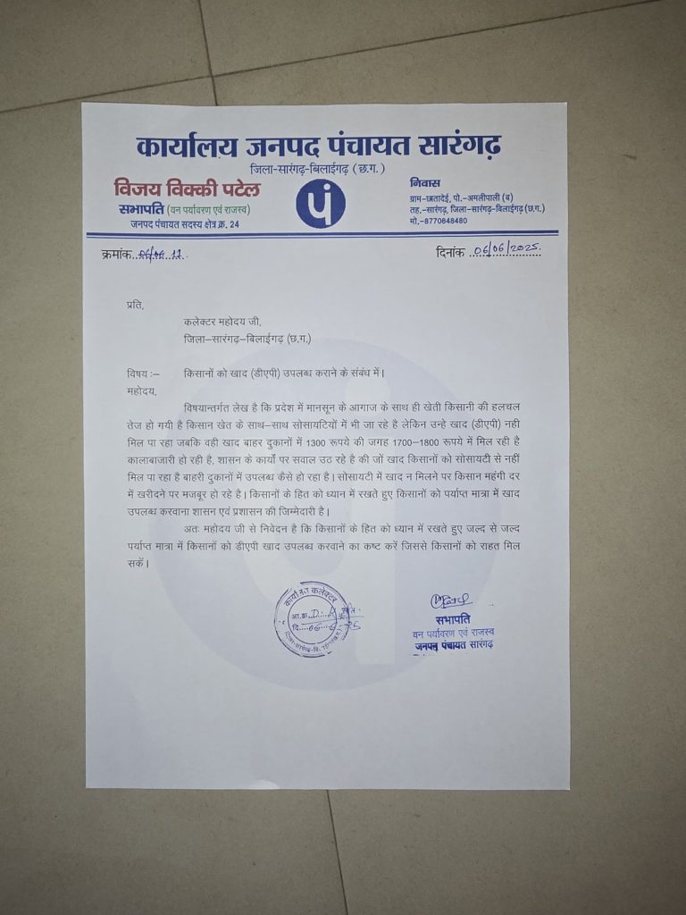सारंगढ़ – किसानों को सोसायटी में खाद न मिलने की समस्या को देखते हुए क्षेत्र क्रमांक 24 के जनपद सदस्य एवं वन, राजस्व व पर्यावरण विभाग के सभापति विजय विक्की पटेल ने किसानों को पर्याप्त मात्रा में खाद (डीएपी) उपलब्ध करवाने हेतु जिला कलेक्टर को ज्ञापन सौंपा है उक्त ज्ञापन में उल्लेख किया गया है की प्रदेश में मानसून के आगाज के साथ ही खेती किसानी की हलचल तेज हो गयी है किसान खेत के साथ साथ सोसायटियों में भी जा रहे है लेकिन उन्हें खाद (डीएपी) नहीं मिल पा रहा जबकि वही खाद बाहर दुकानों में 1300 रुपये की जगह 1700-1800 रुपये में मिल रही है कालाबाजारी हो रही है, शासन के कार्यों पर सवाल उठ रहे है की जों खाद किसानों को सोसायटी से नहीं मिल पा रहा है वो बाहरी दुकानों में उपलब्ध कैसे हो रहा है। सोसयटी में खाद न मिलने पर किसान महंगी दर में खरीदने पर मजबूर हो रहे है। किसानों के हित को ध्यान में रखते हुए किसानों को पर्याप्त मात्रा में खाद उपलब्ध करवाना शासन एवं प्रशासन की जिम्मेदारी है।