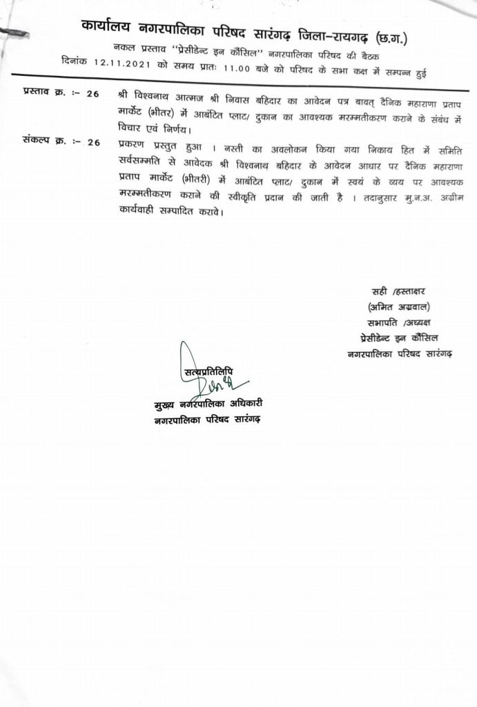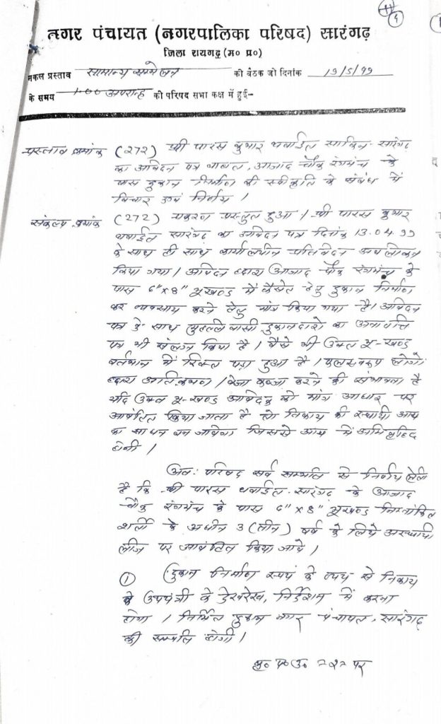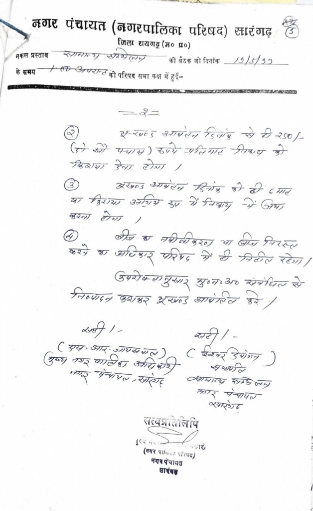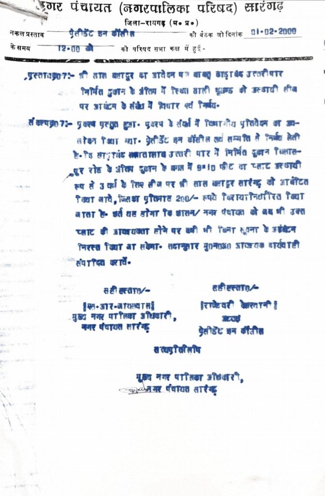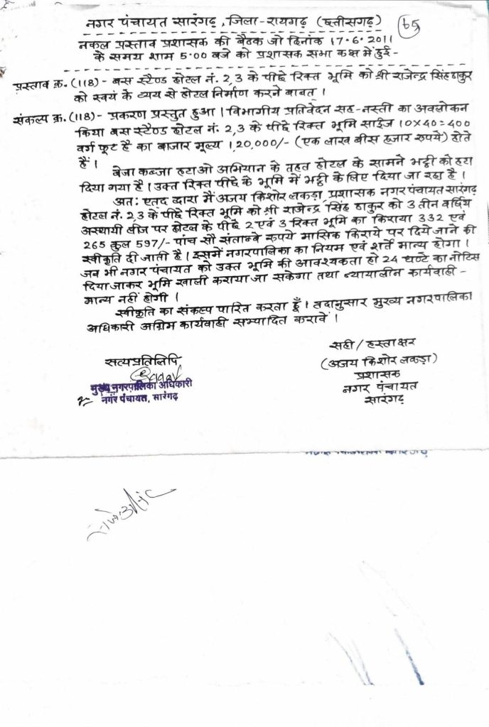 अजय किशोर लकड़ा जो प्रशासक नगर पंचायत ने दिनांक 17 जून 2011 को प्रस्ताव क्रमाक 118 मे प्रस्ताव पारित कर बस स्टैंड होटल नंबर 02 और 03 के पीछे के पीछे 400 वर्गफ़ीट रिक्त भूमि को श्री राजेंद्र सिंह ठाकुर को 597 रुपये मादिक किराये पर लीज पर स्वीकृत किया था।