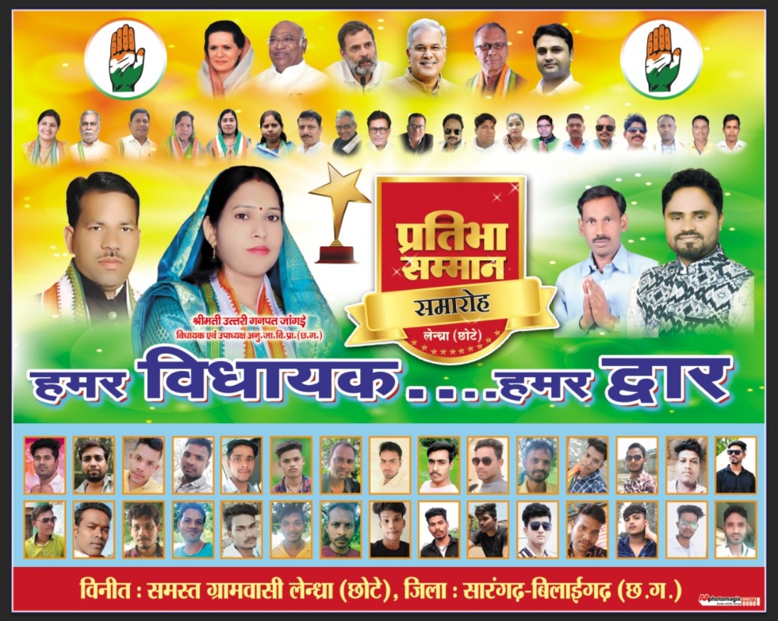आप सब को पुनः कांग्रेस पार्टी के हाथ को मजबूत करते हुए प्रदेश में भूपेश बघेल जी को मुख्यमंत्री एवं सारंगढ़ में उतरी जांगड़े के ऊपर आशीर्वाद बनाना है आप सब ने कार्यक्रम में आमंत्रित किया आप सबको बधाई आभार इसी कड़ी में कार्यक्रम को गौ सेवा आयोग के सदस्य पुरुषोत्तम साहू ने भी संबोधित किया और कहां की बड़े खुशी की बात है आपके गांव में प्रतिभा सम्मान समारोह आयोजित हुई है जिसमें हम सब को शामिल होने सौभाग्य प्राप्त हुए आप सब ने अभूतपूर्व स्वागत किया आप सबको पता है छत्तीसगढ़ में भूपेश बघेल की सरकार एवं सारंगढ़ विधायक उत्तरी जांगड़े लगातार विकास कार्य कर रही हैं उत्तरी जांगड़े की सक्रियता के कारण ही आज सारंगढ़ जिला बना और सारंगढ़ में सभी प्रकार की सुविधा धीरे-धीरे शुरू होगी इसी तरह आगे भी कांग्रेस पार्टी के ऊपर आप सब का आशीर्वाद बना रहे और पुनः सारंगढ़ में उत्तरी जांगड़े को विधायक चुने ताकि विकास कार्य और तेजी से हो अंत में कार्यक्रम को श्रीमती उत्तरी जांगड़े विधायक सारंगढ़ ने संबोधित किया और कहा आप सब ने गाजे बाजे कर्मा नृत्य के साथ स्वागत अभिनंदन किया आप सबको हृदय से आभार आयोजन समिति द्वारा बहुत ही सुंदर प्रतिभा सम्मान समारोह आयोजित की गई है जिसमें हमारे प्रतिभावान बाल बच्चे आज सम्मानित होंगे जो खुशी की बात है पूर्वक्ताओं ने आप सबको लगभग सभी बातें बताई आज आप सब लोगों के बीच मैं आशीर्वाद मांगने आई हूं पिछले बार 52000 वोट से विजई बनाए थे जिसके लिए आप सबको बहुत-बहुत आभार भुपेश बघेल जी ने सारंगढ़ को जिला बनाया जो आप सबके 52000 वोट के कारण सारंगढ़ जिला बना है पूर्व मुख्यमंत्री डॉ रमन सिंह ने सारंगढ़ खेलभांठा मैदान में सभा के दौरान कहा था कि आप लोग विधायक चुन कर दो मैं जिला बनाऊंगा हमारी सारंगढ़ की भोली भाली जनता ने विधायक चुन कर दिया लेकिन उनके विधायक ने कभी भी अपने नेताओं से जिला बनाने की मांग नहीं की और आप सबके लिए मैंने हर मंच में सारंगढ़ को एक छोटा सा जिला बनाने मांग की आप सबके आशीर्वाद से सारंगढ़ जिला बना जिला बनने के पहले हमारे बाल बच्चे बड़े-बड़े शहरों में पढ़ने लिखने जाते थे तो हम सब माता ओं को बच्चों की चिंता लगी रहती थी लेकिन अब सारंगढ़ में महाविद्यालय खुलवाए हैं जिसमें अब हमारे बाल बच्चे उच्च शिक्षा ग्रहण करेंगे और अपने माता-पिता का नाम रोशन करेंगे इन्हीं बच्चों में से कोई कलेक्टर एसपी विधायक बनेंगे आप सब बच्चे बढ़िया से पढ़े लिखे निश्चित ही सारंगढ़ जिला बना है जिसके कारण आप सबको लाभ मिलेगा जिससे हमारे घर परिवार चलेंगे और हमें बाहर काम करने जाने की जरूरत नहीं पड़ेगी हमारे मुख्यमंत्री भूपेश बघेल ने कितनी बड़ी सौगात दी है 8 किलोमीटर के अंदर में कलेक्टर एसपी बैठ रहे हैं और महावि