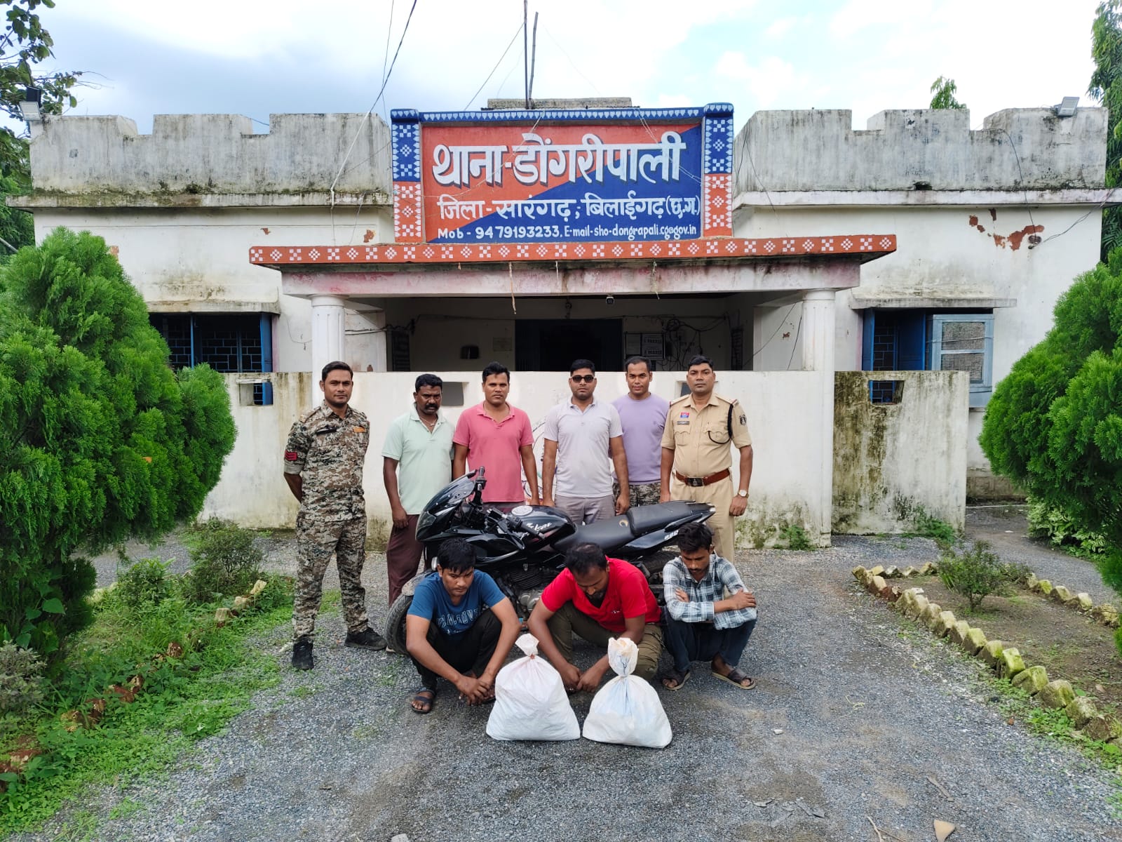 पुलिस अधीक्षक श्री आंजनेय वार्ष्णेय के द्वारा जिले के सभी थाना/चौकी प्रभारियों को जुआ, सट्टा, शराब, अवैध मादक पदार्थ गांजा में संलिप्त व्यक्तियों के उपर कड़ी से कड़ी कार्यवाही करने की निर्देश पर अति0 पुलिस अधीक्षक श्रीमती निमिषा पाण्डेय एवं उप पुलिस अधीक्षक मुख्यालय सारंगढ़ श्री अविनाश मिश्रा के कुशल मार्गदर्शन में थाना प्रभारी भगवती प्रसाद कुर्रे के नेतृत्व मे आज दिनांक 10/07/2025 को जरिये मुखबीर सुचना पर ग्राम डोंगरीपाली स्कूल के पास मेन रोड में घेराबंदी कर मोटर सायकल में आ रहे 03 संदिग्ध व्यक्तियों के कब्जे से बैग में रखा हुआ 03 पैकेट मादक पदार्थ गांजा कुल 03 किलो 30 ग्राम एवं घटना मे प्रयुक्त 02 नग मोबाईल एवं एक काला रंग की पल्सर मोटर सायकल जुमला किमती लगभग 119500 रूपये को जप्त कर धारा 20 बी ,29 NDPS ACT के तहत विधिवत कार्यवाही कर *आरोपीगण के विरूद्ध *थाना डोंगरीपाली मे धारा 20 बी ,59 NDPS ACT का अपराध पंजीबद्ध कर आरोपीगणों को न्यायिक रिमांड पर जेल भेजा गया है।