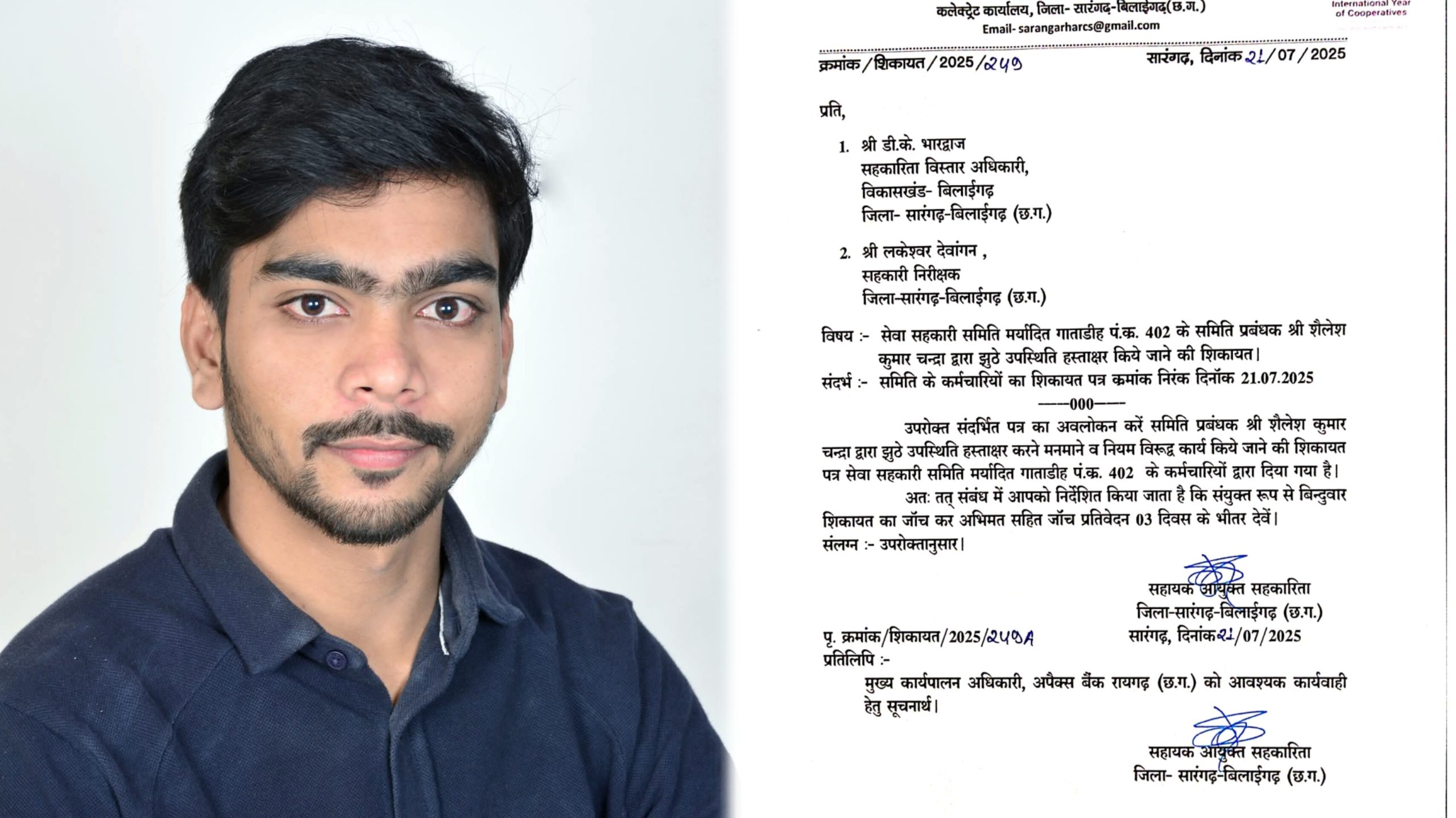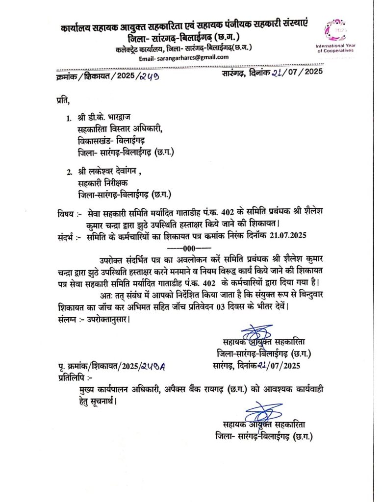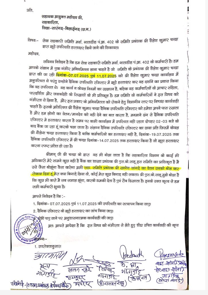 सारंगढ़ बिलाईगढ़ :- सेवा सहकारी समिति गाताडीह में जून एवं जुलाई माह के दौरान फर्जी मानदेय भुगतान का गंभीर मामला सामने आया है। समिति प्रबंधक श्री शैलेश कुमार चंद्रा एवं अपैक्स बैंक के शाखा प्रबंधक (प्राधिकृत अधिकारी) श्री एस.के. साहू पर आरोप है कि दोनों ने मिलीभगत कर बिना कार्य के फर्जी नामों पर मानदेय स्वीकृत कर भुगतान करवा दिया।