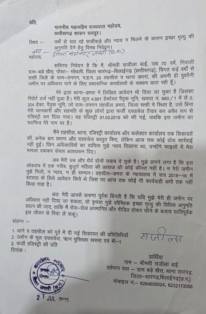 पीड़िता ने कलेक्टर कार्यालय के द्वारा छत्तीसगढ़ के राज्यपाल को औपचारिक पत्र भेजकर इच्छा मृत्यु की अनुमति मांगी है। इसमें उन्होंने अपना दर्द, दस्तावेज और प्रशासनिक उदासीनता के प्रमाण भी जोड़े हैं। अब देखना होगा क्या सिस्टम अब सिर्फ रसूखदारों के लिए काम करता है..? या फिर एक 70 वर्षीय महिला को न्याय दिलाता है..? यदि शासन इस मामले में अब भी चुप रहा, तो यह सिर्फ एक महिला की हार नहीं होगी, बल्कि न्याय और संवैधानिक व्यवस्था की भी हार होगी। यह मामला सिर्फ एक महिला की ज़मीन पर फर्जीवाड़े का नहीं है, बल्कि पूरे सिस्टम की कार्यप्रणाली पर प्रश्नचिन्ह है। जब तक इस तरह की घटनाओं पर सख्त कार्यवाही नहीं होती, भू-माफिया गरीब, महिला और बुजुर्गों के हक़ छीनते रहेंगे।