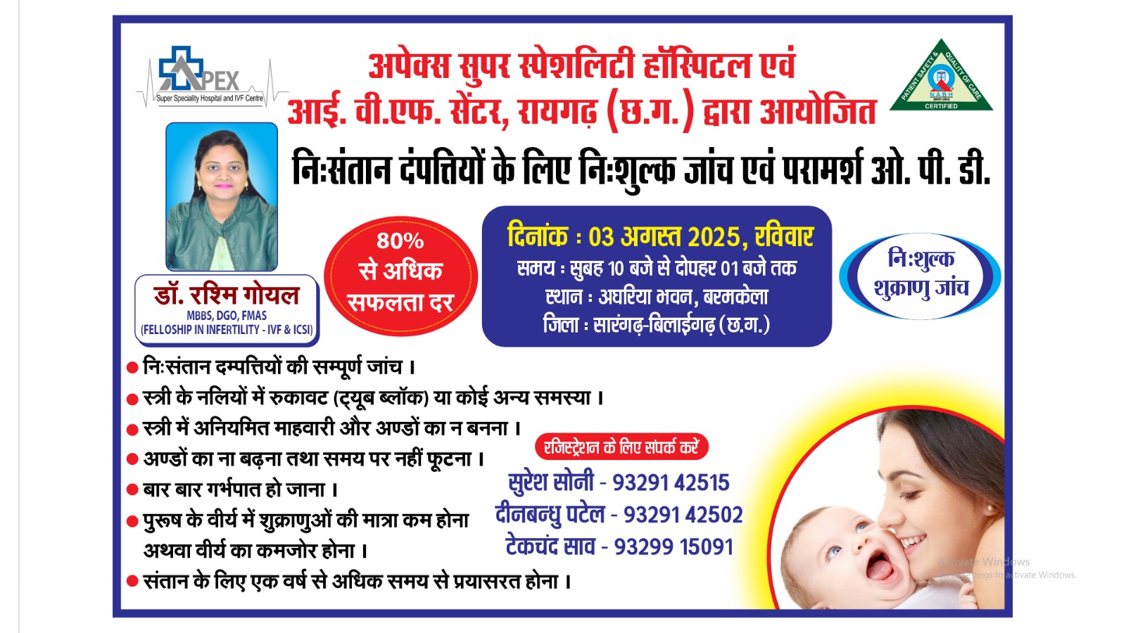 अपेक्स सुपरस्पेशलिटी हॉस्पिटल एवं आईवीएफ सेंटर रायगढ़ के द्वारा 03 अगस्त 2025,दिन रविवार