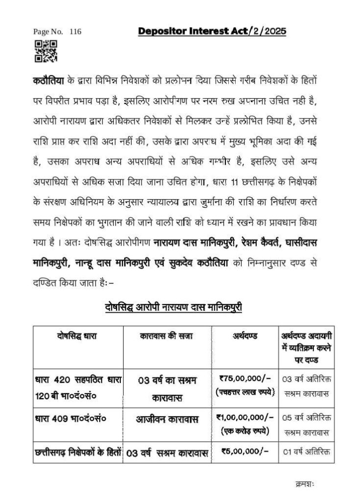 भारतीय दंड संहिता की धारा 420 (धोखाधड़ी) के तहत 3 वर्ष सश्रम कारावास एवं ₹75 लाख अर्थदंड धारा 409 (आपराधिक न्यासभंग) के तहत आजीवन कारावास एवं ₹1 करोड़ अर्थदंड छत्तीसगढ़ निक्षेपकों के हितों का संरक्षण अधिनियम, 2005 की धारा 10 के तहत 3 वर्ष सश्रम कारावास एवं ₹5 लाख जुर्माना