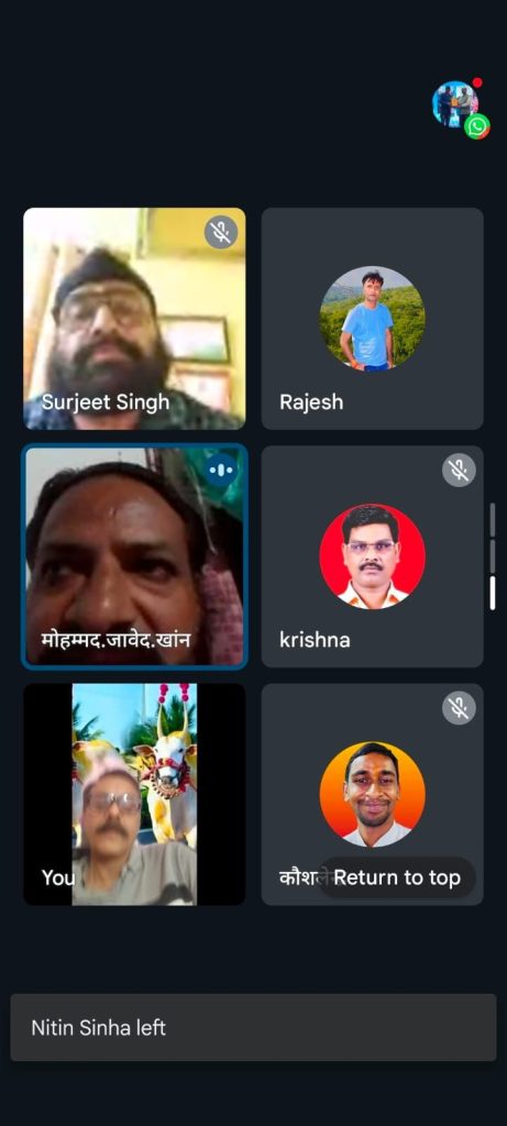 इस ऑनलाइन मीटिंग में प्रदेश के समस्त पदाधिकारी जिसमे पुष्पा रोकडे बहन, राकेश ताम्बोली, राजेश सोनी,राजा खान, नवरतन शर्मा, सुरजीत सिंह रैना, नरेश चौहान, कृष्णा गंजीर, दीपक, कृष्णा महिलांगे, दिनेश जोहले,नारायण बाइन,रामेश्वर वैष्णव, जावेद खान, कैलाश आचार्य,मनीष,प्रशांत,कौशलेन्द्र यादव,डी पी गोस्वामी, अरुण,नितिन रोकडे, प्रवीण निशी, सुशील बखला,नाहिदा कुरैशी, रवि शुक्ला, संजय शर्मा, अरविन्द शर्मा, दीपक साहू, अरुण शेंडे, गोपाल शर्मा, आदि सदस्य शामिल हुए.
