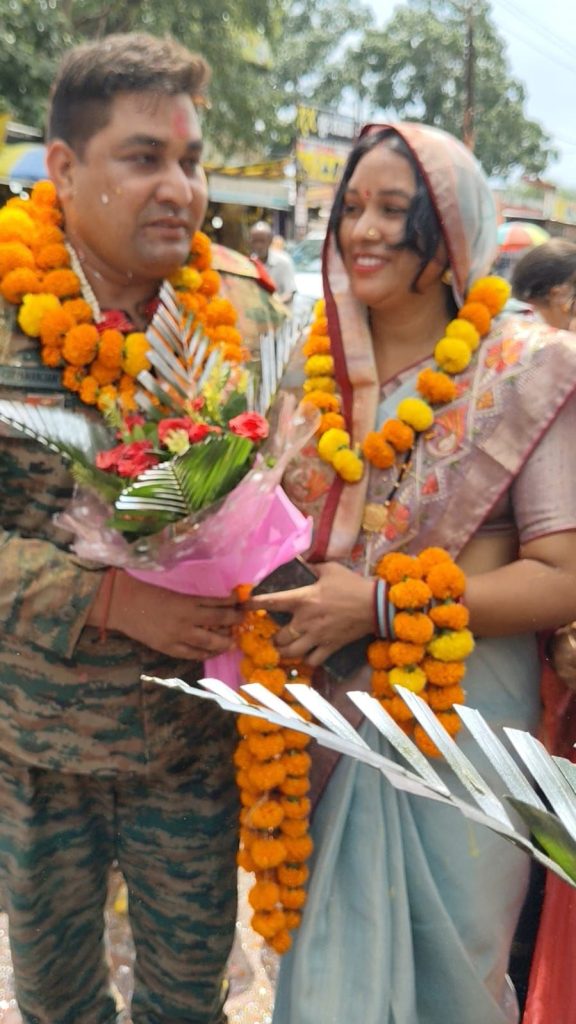 सारंगढ़ बिलाईगढ़ :- देश के अनियत्र जगह मे सेवा करते हुई पठान कोट चामुंडा देवी की नगरी सैन्य अड्डे – मैमोन कैंट में राष्ट्र सेवा कर अपने घर लौटे भारतीय सेवा के जवान चित्रंजन रात्रे जोरा गांव के लोगों ने अभूतपूर्व स्वागत किया. स्वागत के नजारे को देखकर कोई भी बता सकता है आम जनता के मन मे भारतीय सेना का क्या स्थान है. भारतीय थल सेना में रहकर 21 वर्ष राष्ट्र रक्षा करके सेवा निवृत्त हुए जवान चित्रंजन रात्रे को पुरे ग्रामवासी भटगांव लेने बड़ी संख्या में परिवार ग्रामावाशी और युवा पहुंचे.