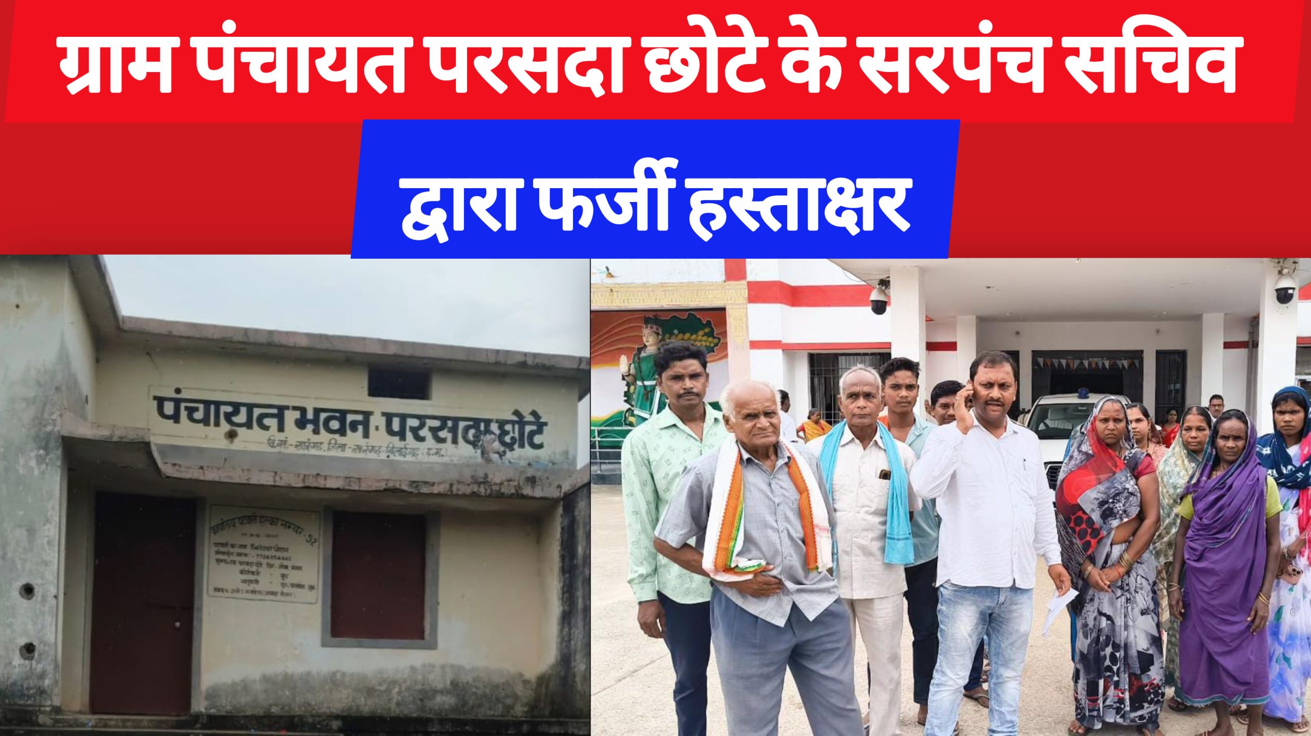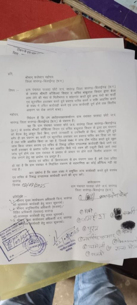सारंगढ़ बिलाईगढ़ :- सारंगढ़ जनपद अंतर्गत आने वाले ग्राम पंचायत परसदा छोटे के सरपंच श्रीमती कौसल्या सिदार व सचिव बाबूलाल सिदार द्वारा पंचो के अनुपस्तिथि मे फर्जी हस्ताक्षर कर बेजा लाभ लेने की मंशा से मिली भगत व सांठगांठ करते हुये अन्य पंच का फर्जी हस्ताक्षर करते हुये