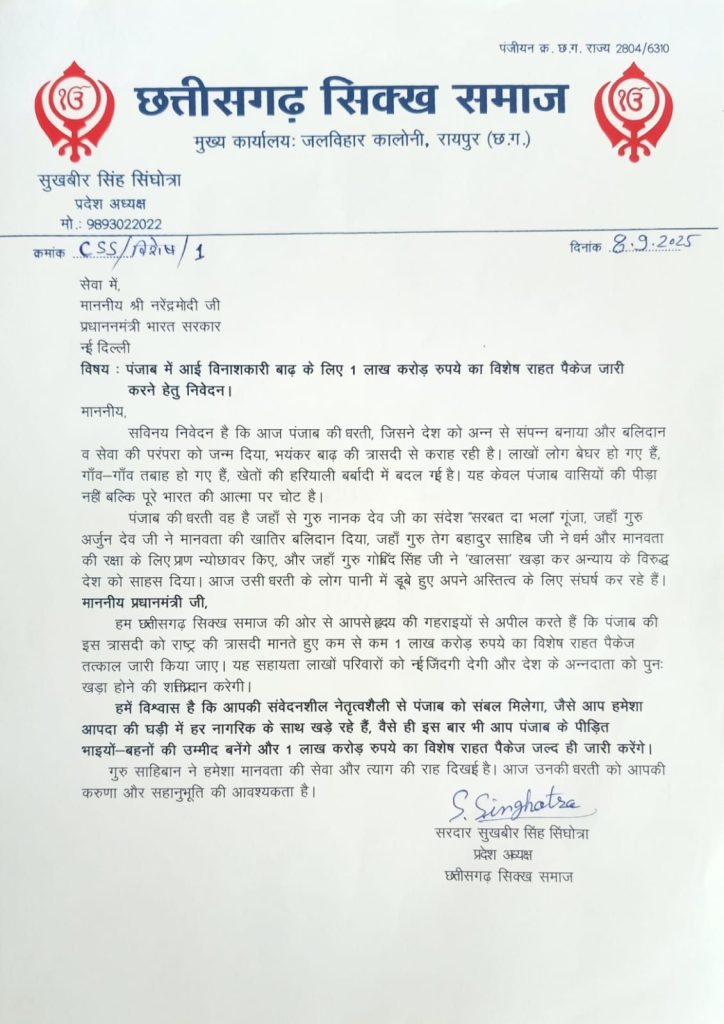 छत्तीसगढ़ :- छत्तीसगढ़ सिक्ख समाज ने प्रधानमंत्री नरेंद्र मोदी को एक पत्र लिखकर पंजाब बाढ़ राहत कोष में एक लाख करोड़ रुपये देने की मांग की है।