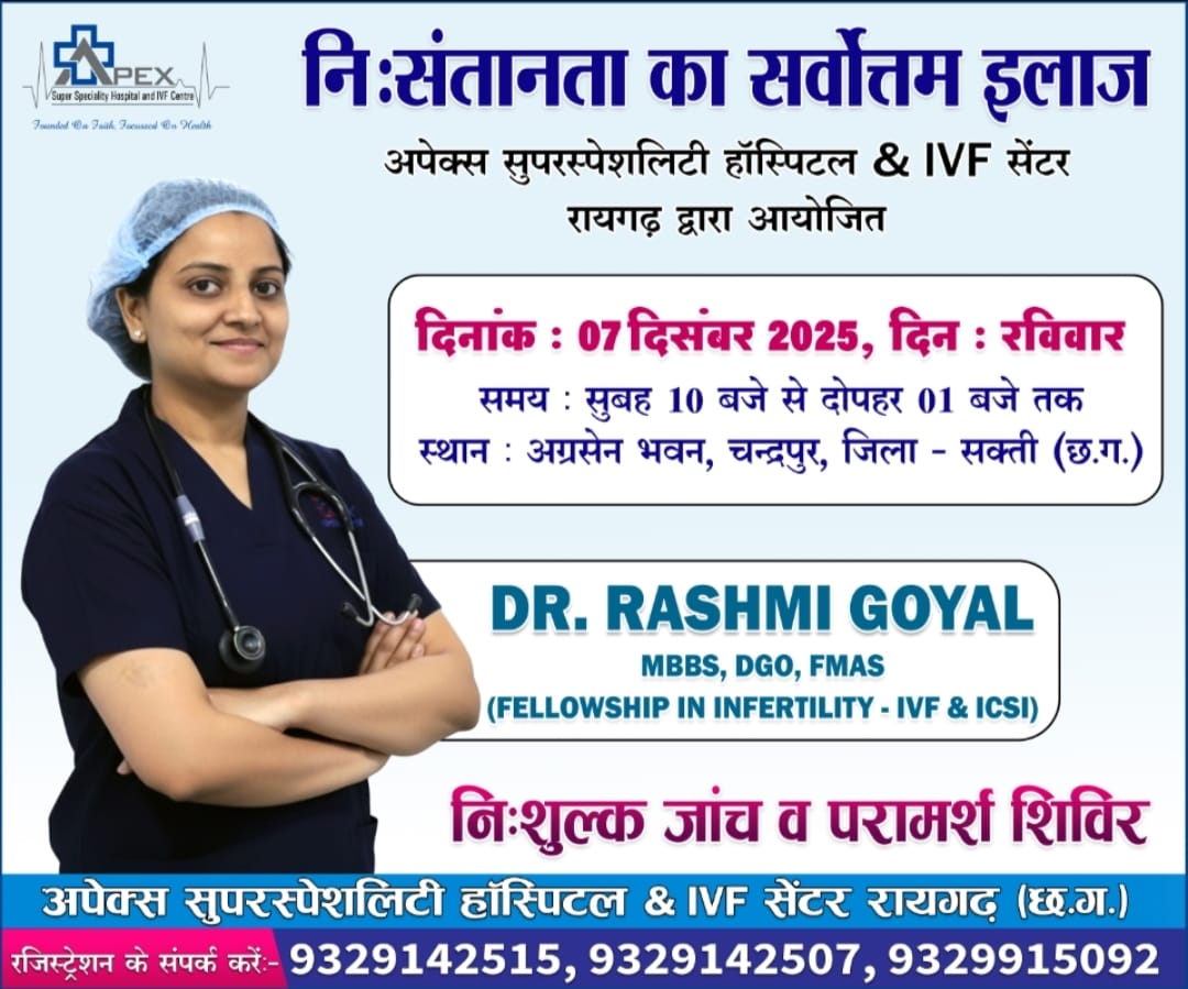 सारंगढ़ बिलाईगढ़ :- अपेक्स सुपरस्पेशलिटी हॉस्पिटल एवम् आईवीएफ सेंटर रायगढ़ के द्वारा आयोजित,निःसंतान दंपतियों के लिए निःशुल्क जांच एवम् परामर्श ओपीडी का आयोजन दिनांक 07 दिसंबर 2025, दिन रविवार को अग्रसेन भवन, चंद्रपुर (छत्तीसगढ़) मे किया जा रहा है जिसमे इनफर्टिलिटी विशेषज्ञ डॉ रश्मि गोयल,निःशुल्क जांच एवम् परमर्श हेतु उपलब्ध रहेंगी।