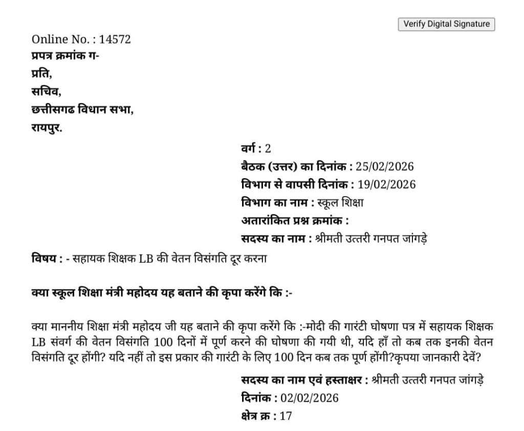 छ ग सहायक शिक्षक समग्र शिक्षक फेडरेशन सारंगढ़ बिलाईगढ़ के अनुरोध पर सहायक शिक्षको कि वेतन विसंगती को सारंगढ़ विधायक ने प्रश्नकाल में शामिल कराया।