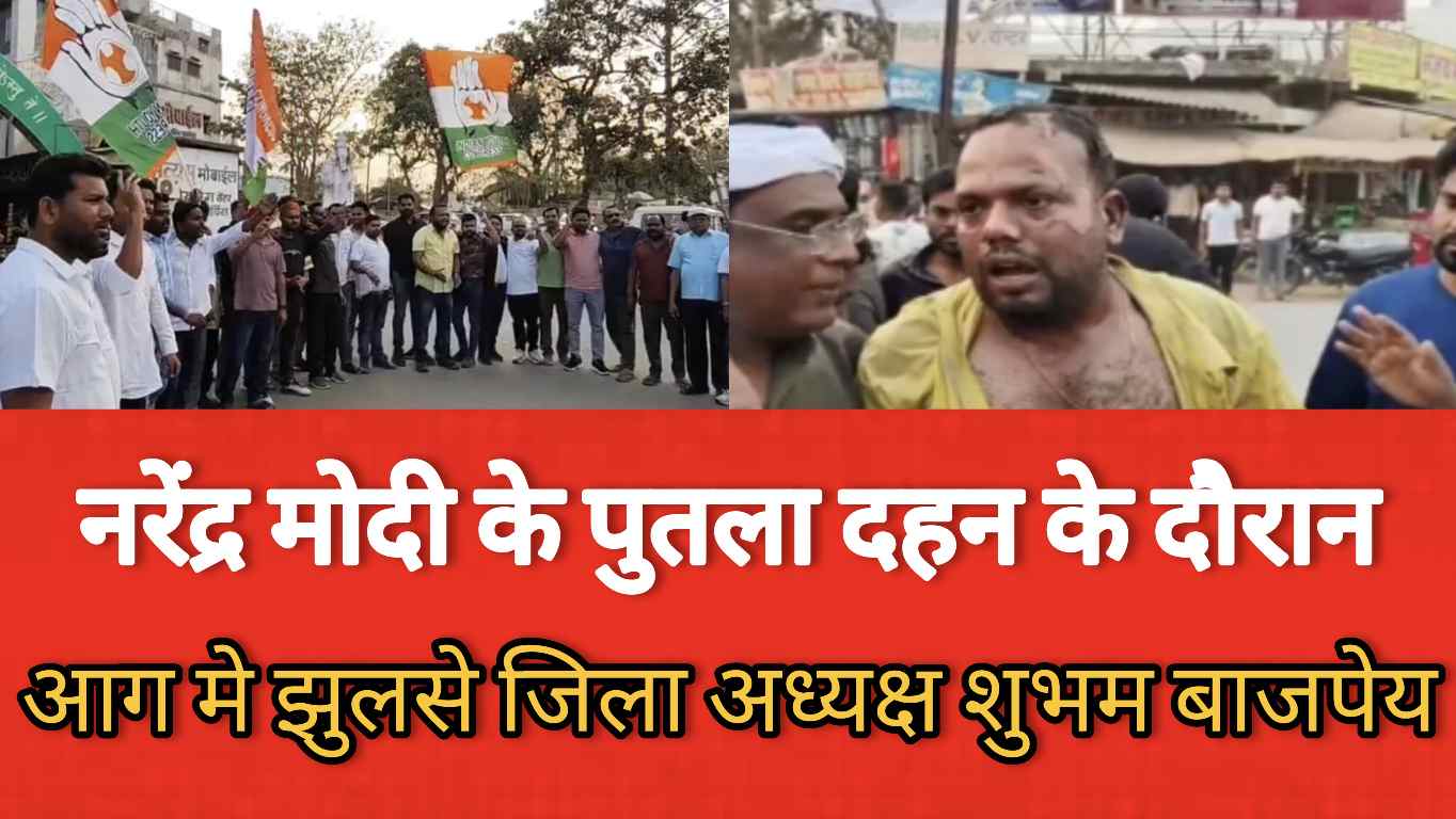 सारंगढ़ बिलाईगढ़ :- सारंगढ़ भारत माता चौक मे कांग्रेस कमेटी के द्वारा प्रधानमंत्री नरेंद्र मोदी का पुतला दहन किया गया इसी दौरान जिला युवा कांग्रेस अध्यक्ष शुभम बाजपेयी आग की चपेट में आकर बुरी तरह झुलस गए, मौके पर हड़कंप मच गया यह घटना भारतीय युवा कांग्रेस के राष्ट्रीय अध्यक्ष उदय भानु चिब की गिरफ्तारी के विरोध में प्रधानमंत्री नरेंद्र मोदी के पुतला दहन के आयोजित प्रदर्शन के दौरान हुई