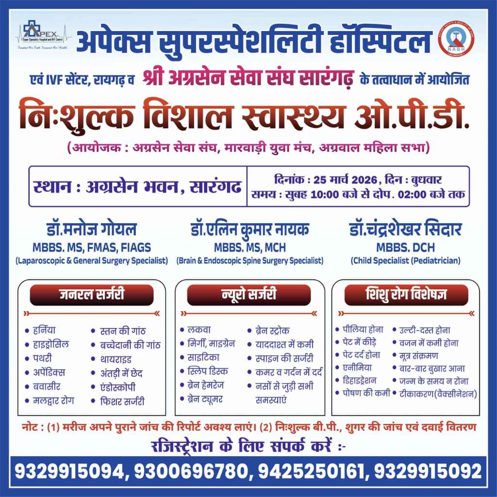 सारंगढ़ बिलाईगढ़ :- अपेक्स सुपरस्पेशलिटी हॉस्पिटल एवं आईवीएफ सेंटर, रायगढ़ तथा श्री अग्रसेन सेवा संघ, मारवाड़ी युवा मंच और मारवाड़ी महिला सभा सारंगढ़ के संयुक्त तत्वावधान में एक निःशुल्क विशाल स्वास्थ्य ओपीडी शिविर का आयोजन किया जा रहा है। यह शिविर 25 मार्च 2026 को सुबह 10 बजे से दोपहर 2 बजे तक अग्रसेन भवन, सारंगढ़ में आयोजित होगा।