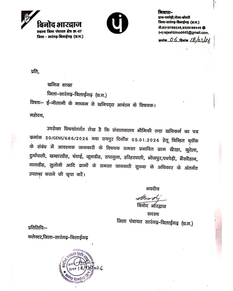सारंगढ़ बिलाईगढ़ :- जिले में खनिज पट्टा आवंटन को लेकर अब सवालों का तूफान उठने लगा है। जिला पंचायत सदस्य विनोद भारद्वाज ने खनिज शाखा को पत्र लिखकर ई-नीलामी प्रक्रिया से जुड़े पूरे मामले की जानकारी सार्वजनिक करने की मांग की है।