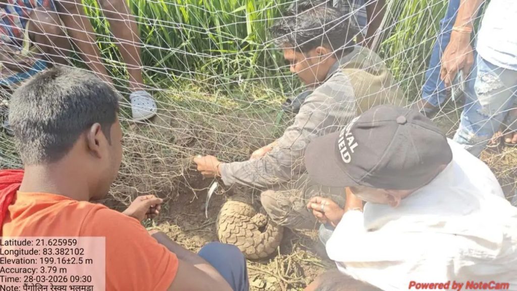 सारंगढ़ बिलाईगढ़ :- वन्यजीव संरक्षण का शानदार उदाहरण उस समय देखने को मिला जब गांव भूलूमुड़ा में एक दुर्लभ पेंगोलीन जाल में फंस गया।जानकारी मिलते ही वन विभाग की टीम ने त्वरित कार्रवाई करते हुए उसे सुरक्षित बाहर निकाला।मिली जानकारी के अनुसार किसान सिंधु साहू पिता टंकधर साहू के मूंगफली फसल लगे खेत में लगाए गए जाली में अचानक एक पेंगोलीन फंस गया। खेत में काम कर रहे ग्रामीणों की नजर जैसे ही इस पर पड़ी तो उन्होंने बिना देर किए वन विभाग को सूचना दी। सूचना मिलते ही विभाग की टीम तत्काल मौके पर पहुंची और पूरे सावधानी व सतर्कता के साथ रेस्क्यू अभियान शुरू किया। रेस्क्यू के दौरान टीम ने बेहद धैर्य और अनुभव का परिचय देते हुए जाल में फंसे पेंगोलीन को सुरक्षित बाहर निकाला। इस दौरान पेंगोलीन को किसी प्रकार की गंभीर चोट नहीं आई और उसे सुरक्षित जंगल में छोड़ दिया गया।