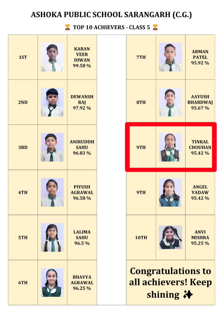 सारंगढ़ :- अशोका पब्लिक स्कूल सारंगढ़ में पढ़ने वाली होनहार छात्रा टिंकल चौहान ने कक्षा 5वीं में शानदार प्रदर्शन करते हुए 95.42% अंक प्राप्त कर टॉप-10 सूची में 9वां स्थान हासिल किया है। इस उपलब्धि से न सिर्फ परिवार बल्कि पूरे क्षेत्र में खुशी और गर्व का माहौल है।