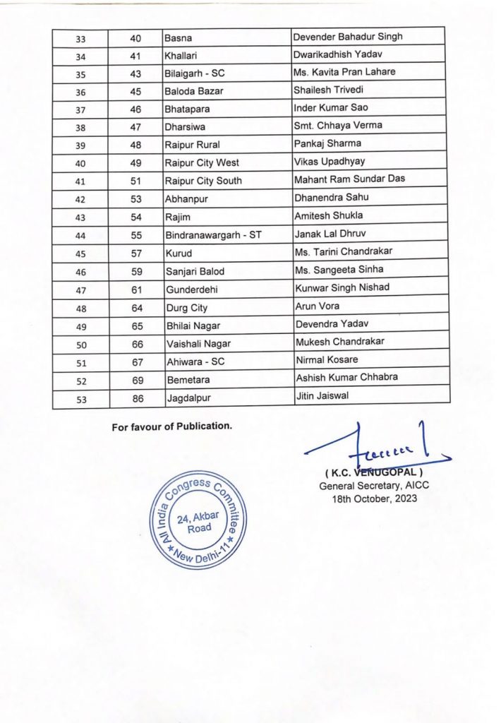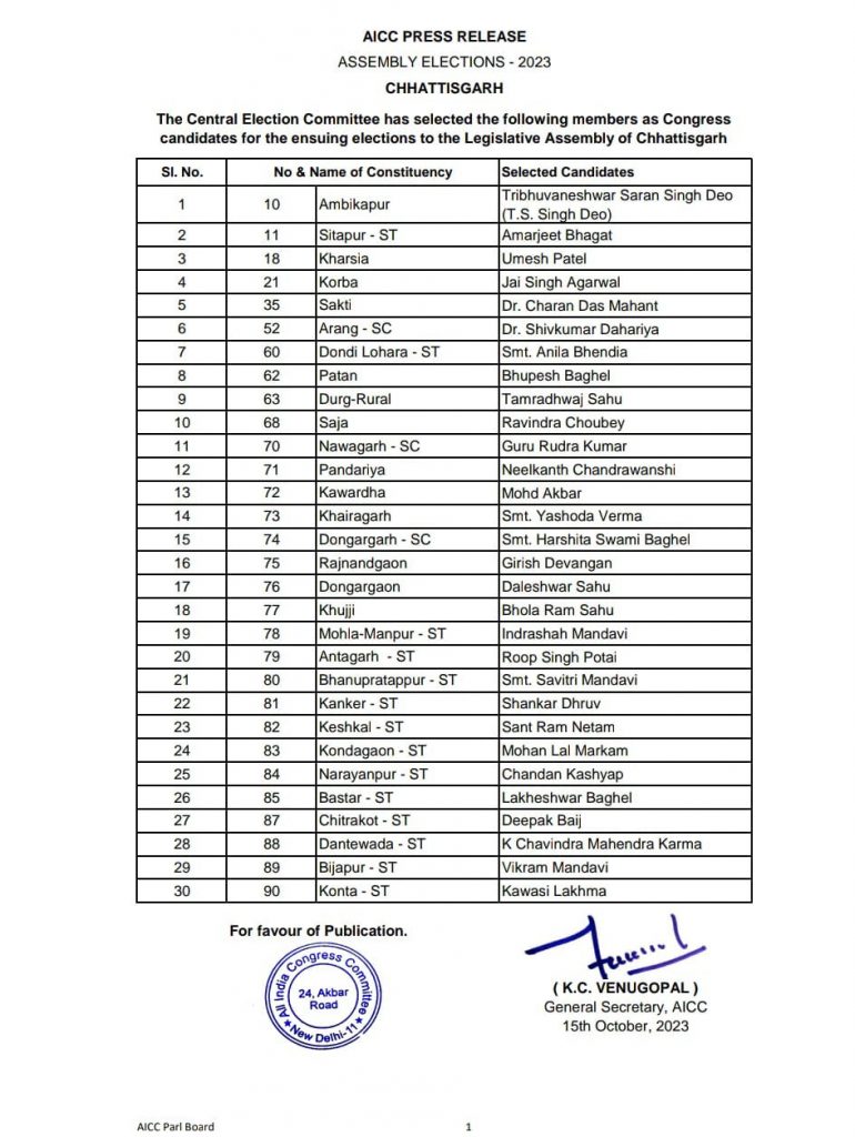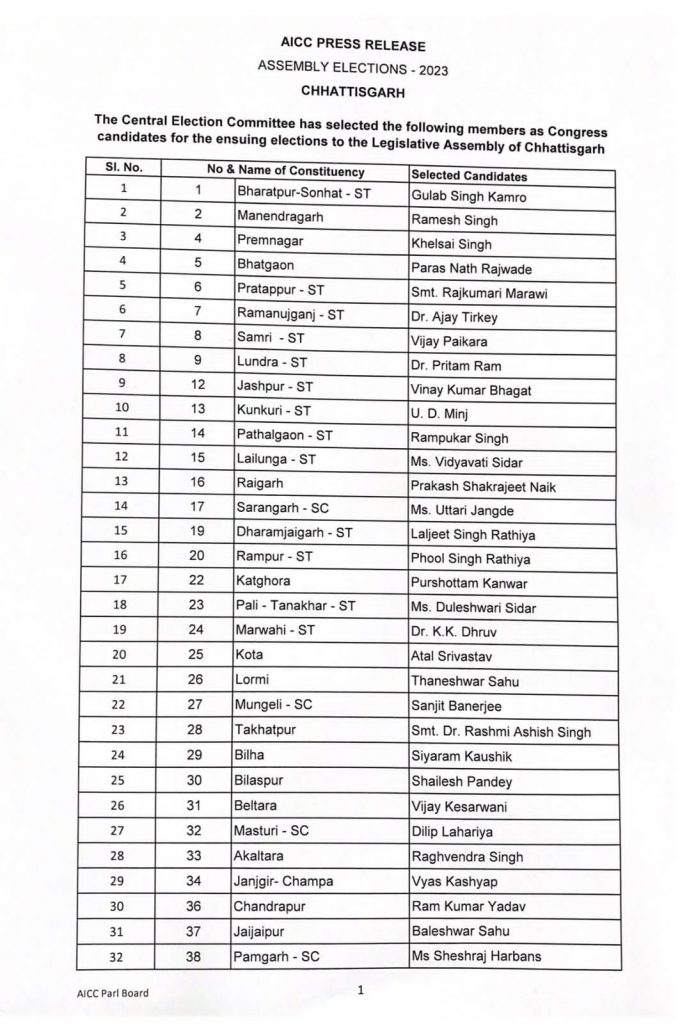 रायपुर :- कांग्रेस ने प्रत्याशियों की पहली व दूसरी सूची जारी कर दी है. इन सूचीयो में 83 प्रत्याशियों के नाम हैं. केवल 7 प्रत्य़ाशियों का नाम आना बाकी है. जिसमें 18 विधायकों का टिकट काटा गया है